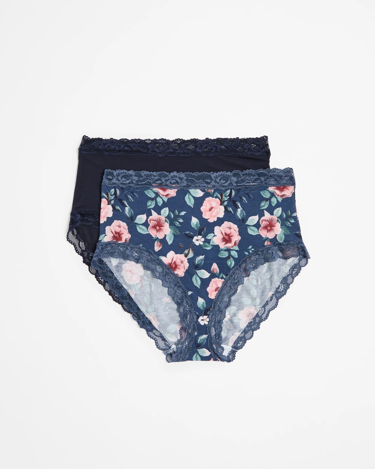 Experience unparalleled comfort and style with our 2 Pack Modal and Lace Full Briefs. These women's briefs are made from a soft modal-rich fabric and feature stretch elastane for the perfect fit. The inclusion of Tencel fibres ensures an incredibly soft feel against your skin. Available in beautiful Audrey bloom and navy blue colours, these briefs offer full back coverage and sit comfortably at the waist. The lace waistband with thin elastic provides a secure fit, while the delicate lace trim around the low cut leg adds a touch of charm. This great value 2 pack is an excellent addition to your daily essentials.