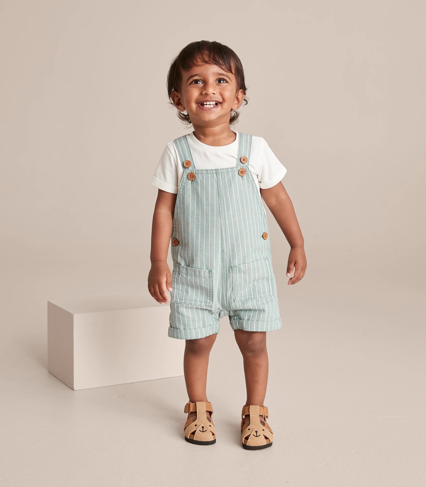 In a cotton rich fabric, the striped 2 Piece Baby Shortall Set features adjustable length buttoned shoulder straps, single button hips, twin front pockets and comes with a basic t-shirt for great value.