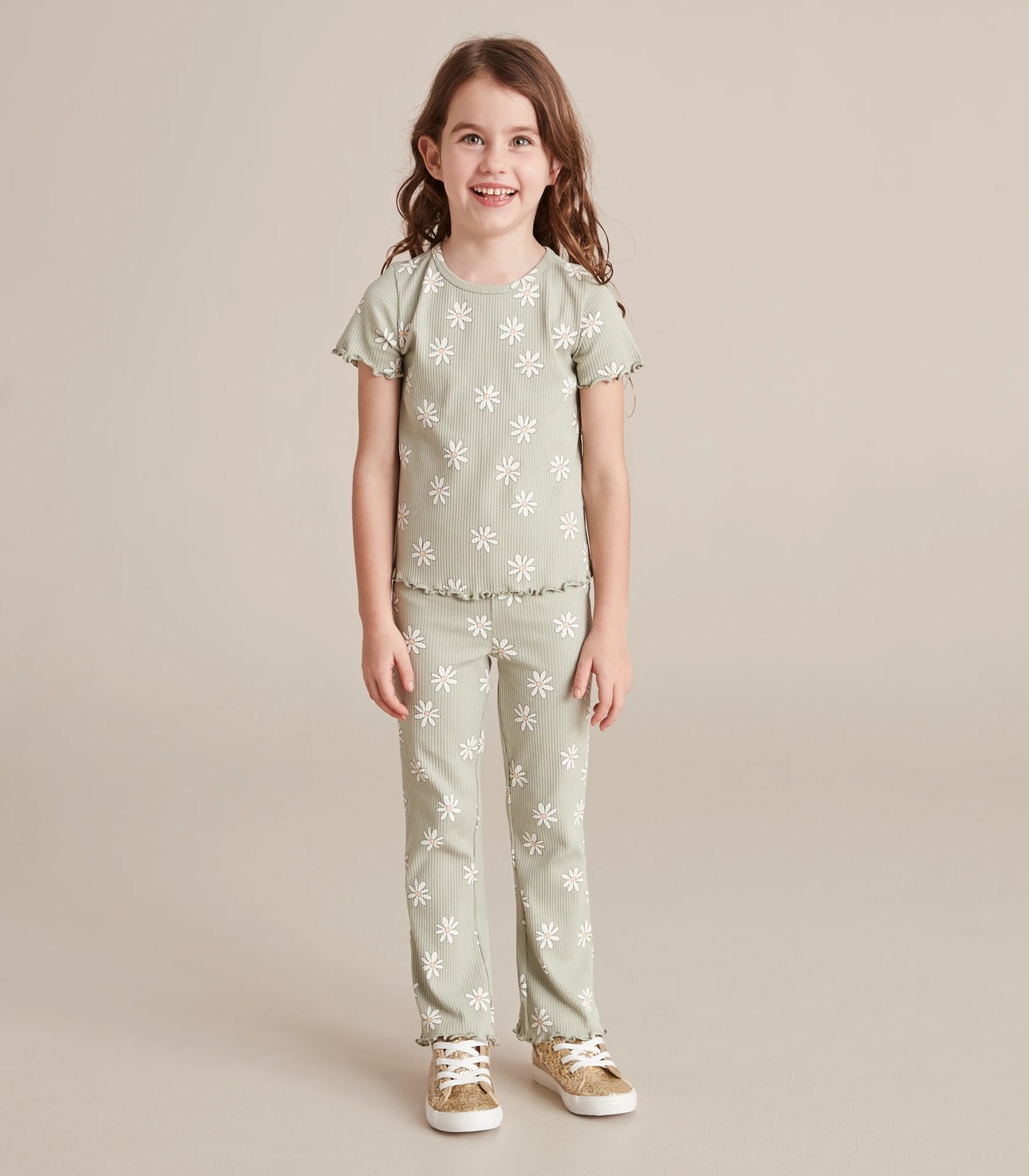 This adorable 2 Piece Daisy Rib Flare Set from Target is perfect for any girls' wardrobe! Crafted from a cotton-rich ribbed fabric, this two-piece set offers great stretch and all-over daisy print. It features short sleeves with lettuce cuffs and lettuce hem, plus an elastic waistband and flare leg with lettuce cuffs. This two piece set is sure to keep her comfortable while she relaxes in style.