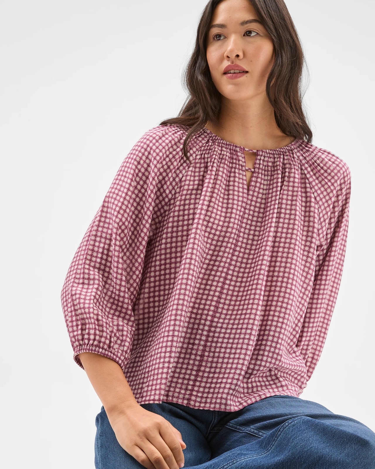 Bring a fresh breath of style to your wardrobe with this 3/4 Sleeve Neck Detail Blouse. Made from a lightweight blend of viscose and recycled nylon, this blouse keeps you feeling cool and comfortable throughout your day. The round ruched neckline with a v-front drop and charming rouleau ties adds a delightful finishing touch. Its regular fit and 3/4 length raglan sleeves with soft elasticated cuffs offer a relaxed feel and plenty of comfort. Whether you’re heading out for brunch or meeting friends, this blouse is a lovely choice to pair with your favourite jeans or skirts. Add it to your collection and enjoy versatile styling options that are simply effortless.