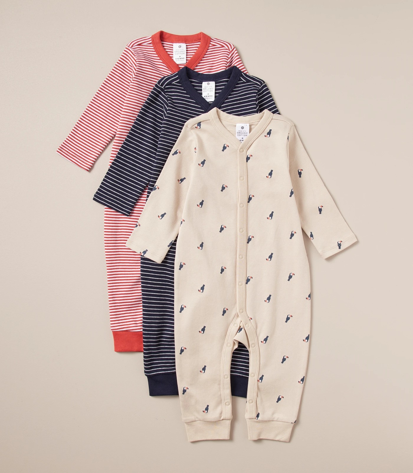 Crafted from soft organic cotton and in a handy multi-pack, comes the 3 Pack Baby Organic Cotton Snap Coveralls. Featuring long sleeves, full snap stud closure and in a variety of colours and prints.