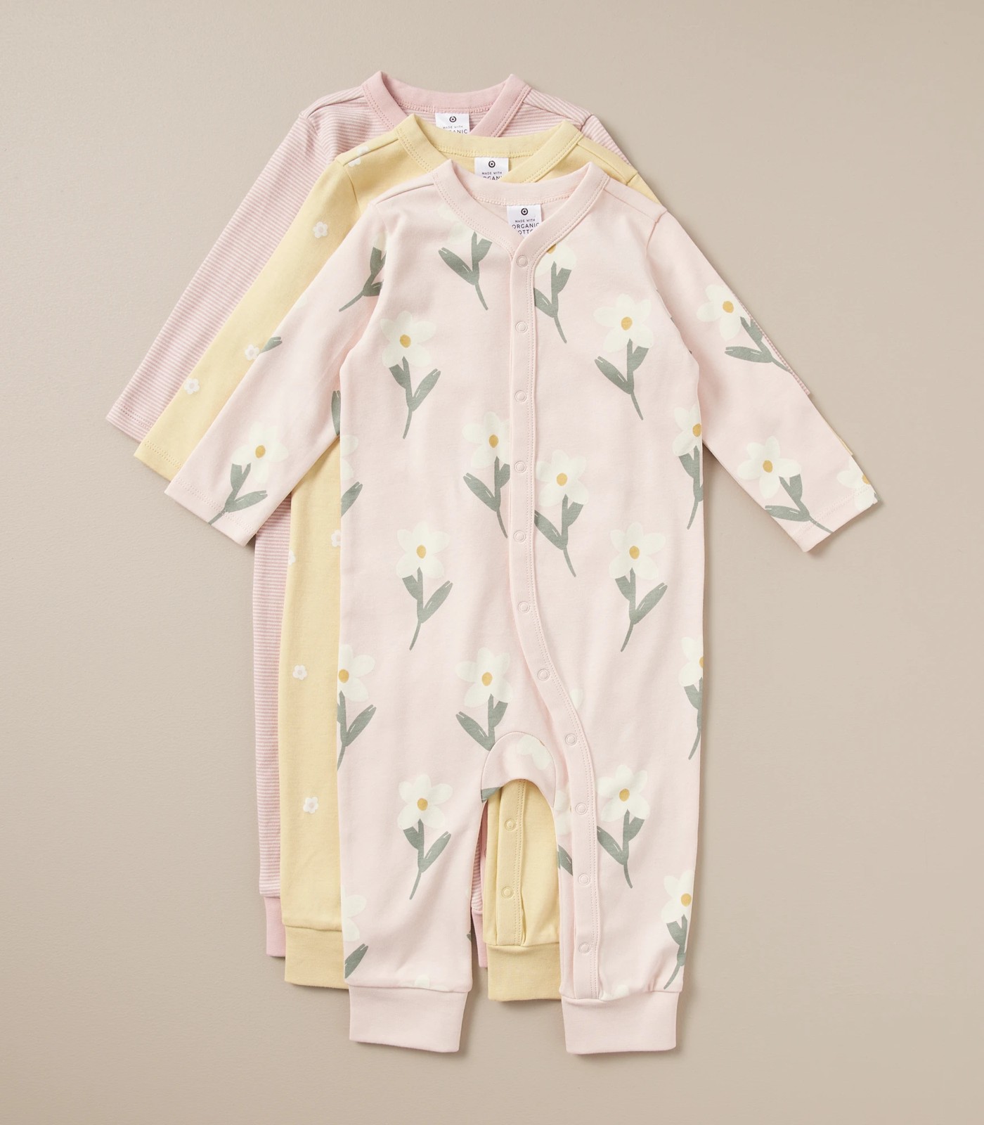 Crafted from soft organic cotton and in a handy multi-pack, comes the 3 Pack Baby Organic Cotton Snap Coveralls. Featuring long sleeves, full snap stud closure and in a variety of colours and prints.