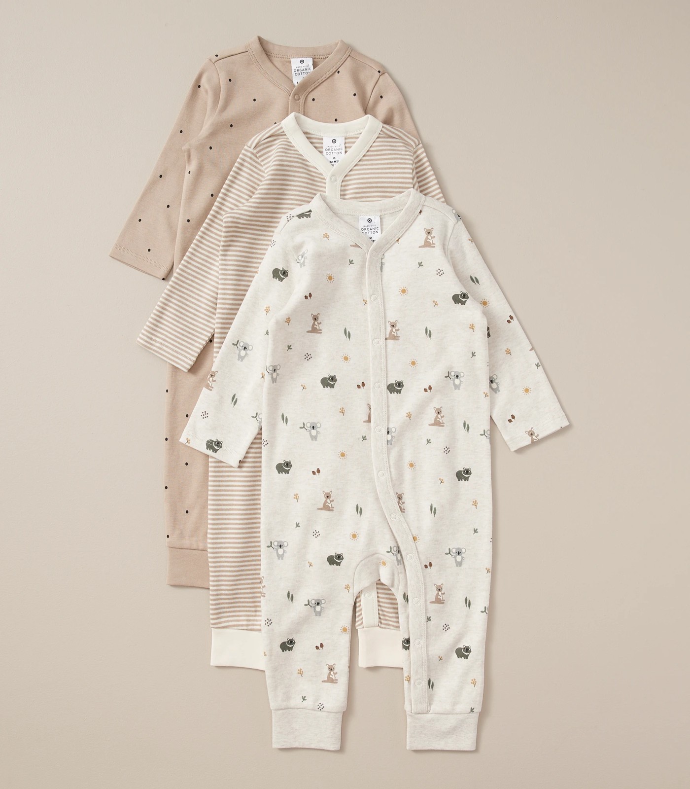 Crafted from soft organic cotton and in a handy multi-pack, comes the 3 Pack Baby Organic Cotton Snap Coveralls. Featuring long sleeves, full snap stud closure and in a variety of colours and prints.