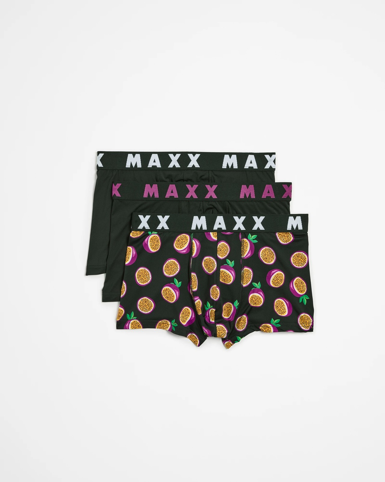 Discover unparalleled comfort and style with our Maxx trunks. Made from nylon with a stretchy elastane, these trunks ensure all-day comfort. The microfibre fabric feels incredibly soft against your skin, while the moisture-wicking properties keep you cool and dry. Boasting a sleek slim fit, these trunks come in a fun passionfruit print and versatile black. Enjoy the perfect fit with a secure front pouch and a thick elastic waistband branded with MAXX. Ideal for daily wear, this value-packed three-pack combines practicality with style. Don’t miss out - upgrade your wardrobe with Maxx trunks today!