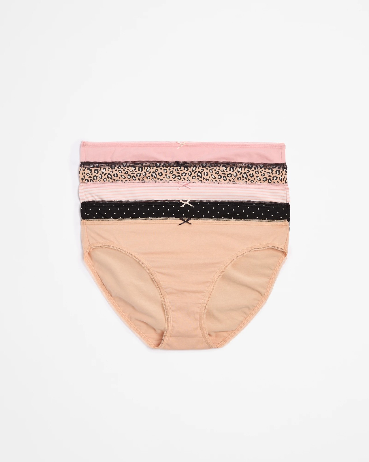 Enhance your comfort with these 5 Pack Cotton/Elastane Bikini Briefs for women. Designed from a cotton-rich blend with added stretch elastane, these briefs provide a soft and breathable fit. Featuring a regular fit and bikini cut, they come in a convenient value pack of five. The low-rise waist is paired with a thin elastic waistband and a decorative bow at the centre. The scalloped trim around the waist and legs adds a charming detail, while the mid-cut leg and full back coverage ensure you stay comfortable all day. Presented in a box, these briefs are perfect for everyday wear.