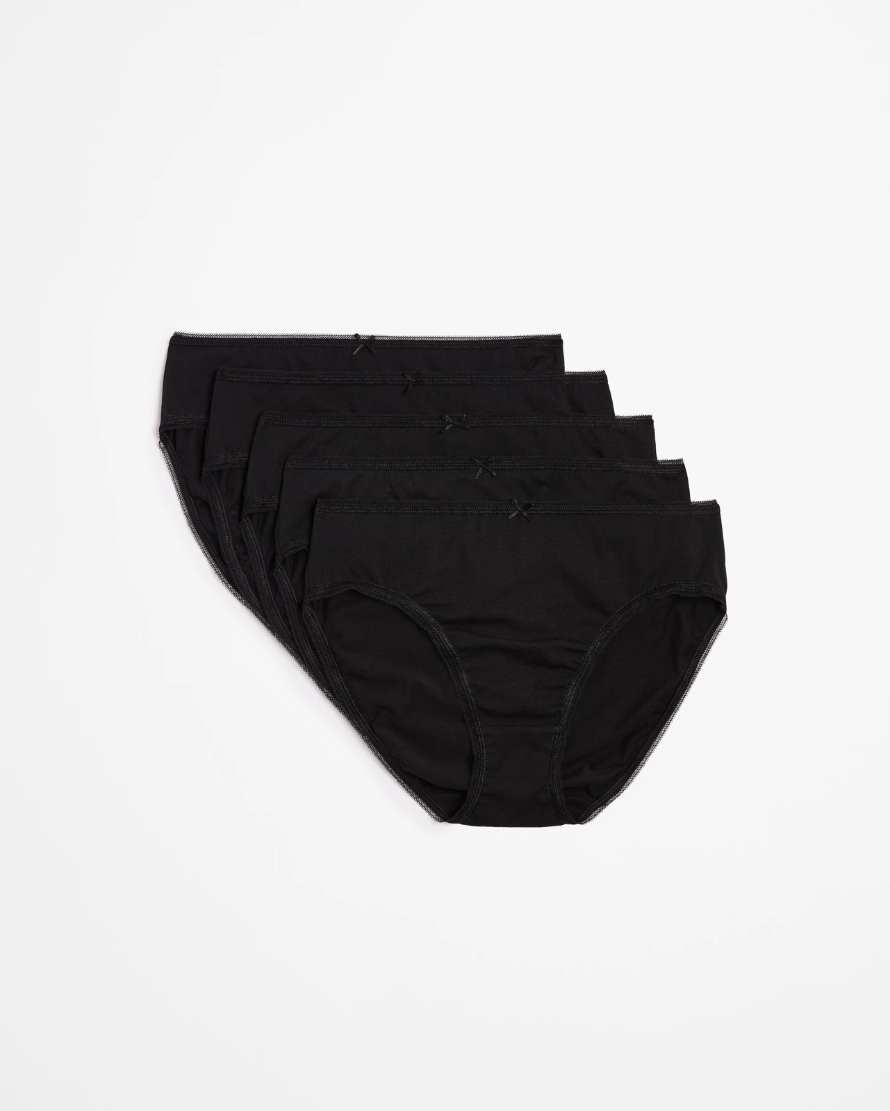 Experience the ultimate comfort every day with our 5 Pack Cotton/Elastane High Cut Briefs. These briefs feature a soft, cotton-rich fabric blended with elastane for a flexible fit that moves with you. Designed to sit perfectly at the waist, they offer a high cut to elongate your legs and full back coverage for maximum comfort. The thin elastic waistband is complemented by a decorative bow, adding a touch of charm, while the scalloped trim around the waist and legs enhances the elegant look. Grab this great value pack and feel confident all day long.