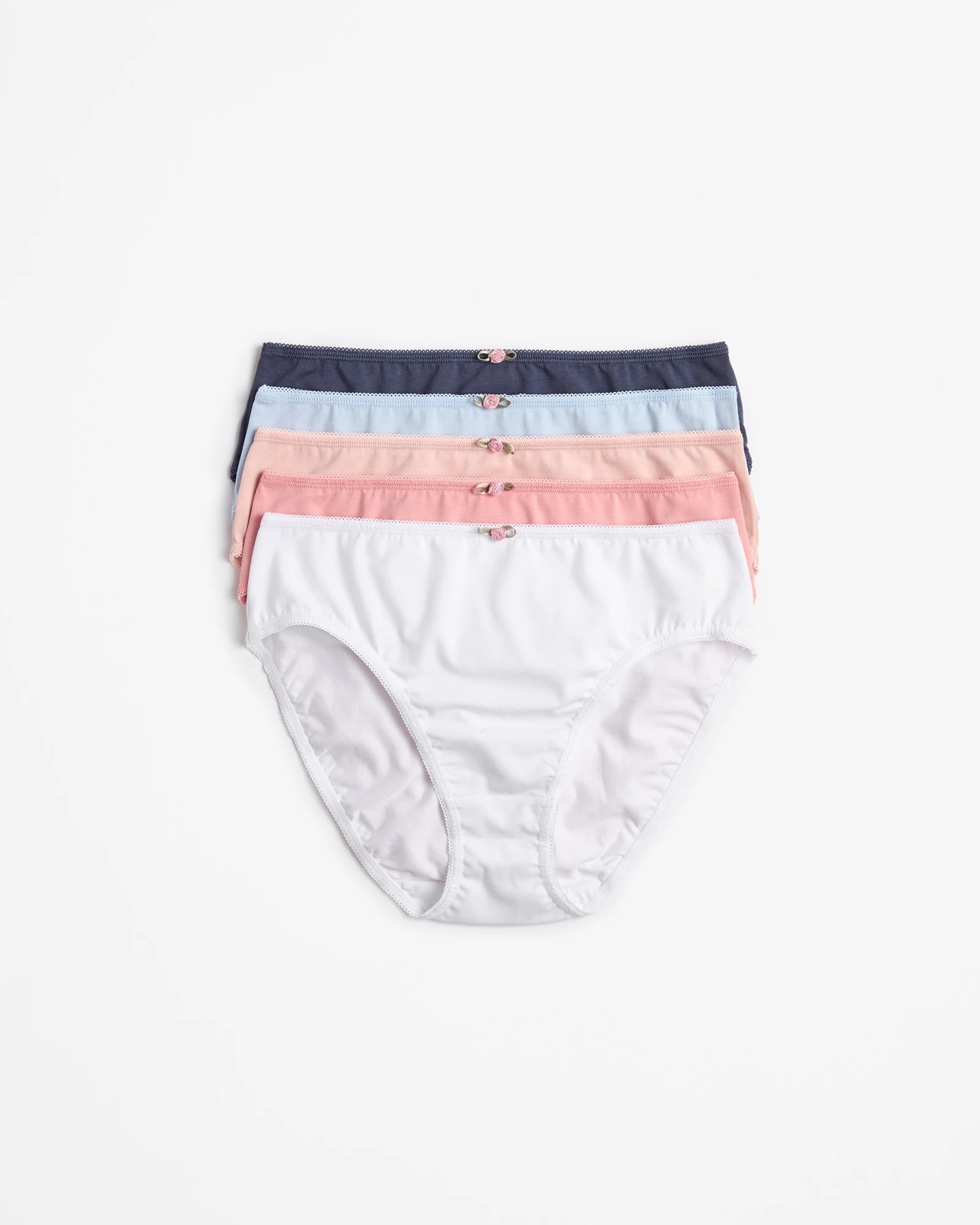 Experience the ultimate comfort every day with our 5 Pack Cotton/Elastane High Cut Briefs. These briefs feature a soft, cotton-rich fabric blended with elastane for a flexible fit that moves with you. Designed to sit perfectly at the waist, they offer a high cut to elongate your legs and full back coverage for maximum comfort. The thin elastic waistband is complemented by a decorative bow, adding a touch of charm, while the scalloped trim around the waist and legs enhances the elegant look. Grab this great value pack and feel confident all day long.