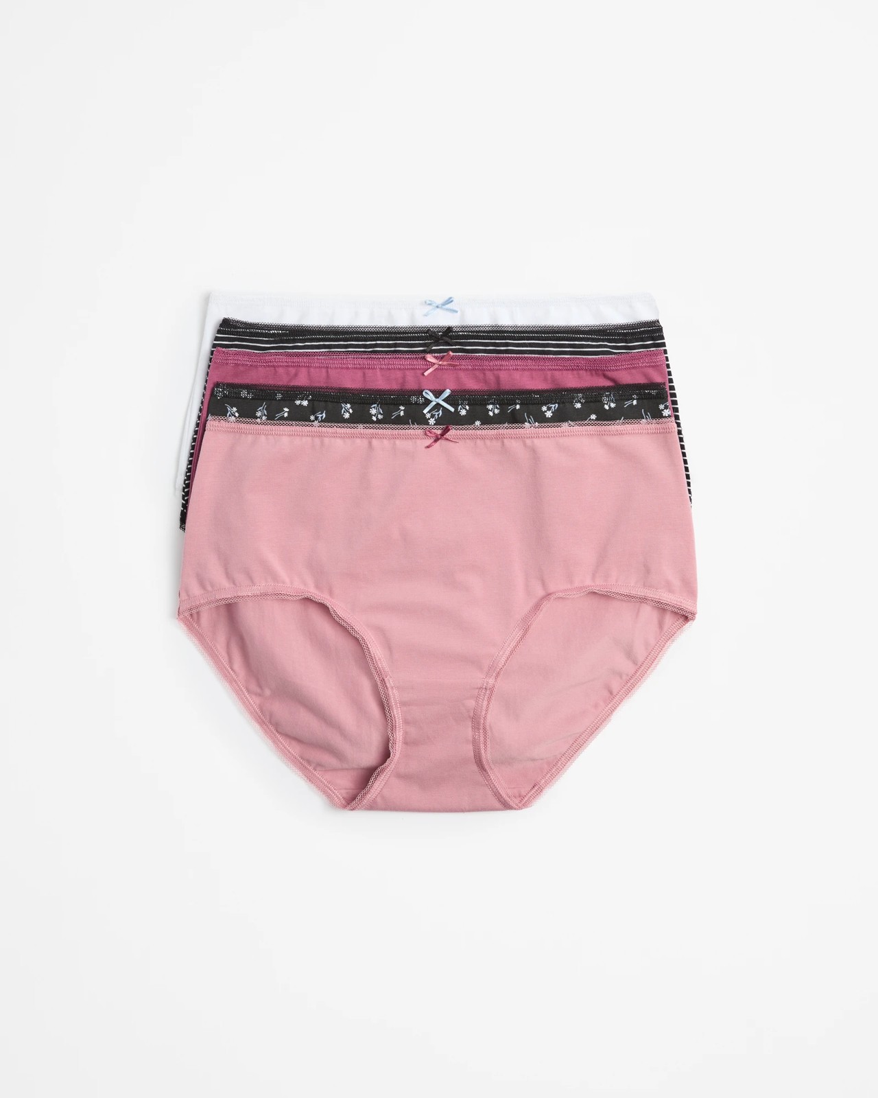 Enjoy unmatched comfort and stylish design with our 5 Pack Cotton/Elastane Midi Briefs. Featuring a soft, cotton-rich fabric and stretchy elastane, these briefs ensure a perfect fit every time. Adorned with charming bows and stripes, they add a fun touch to your everyday essentials. Designed to sit just below the waist with a delicate scalloped trim, they offer full back coverage and a low cut leg for all-day wearability. Packaged conveniently in a boxed set, these briefs are a great value addition to your wardrobe.