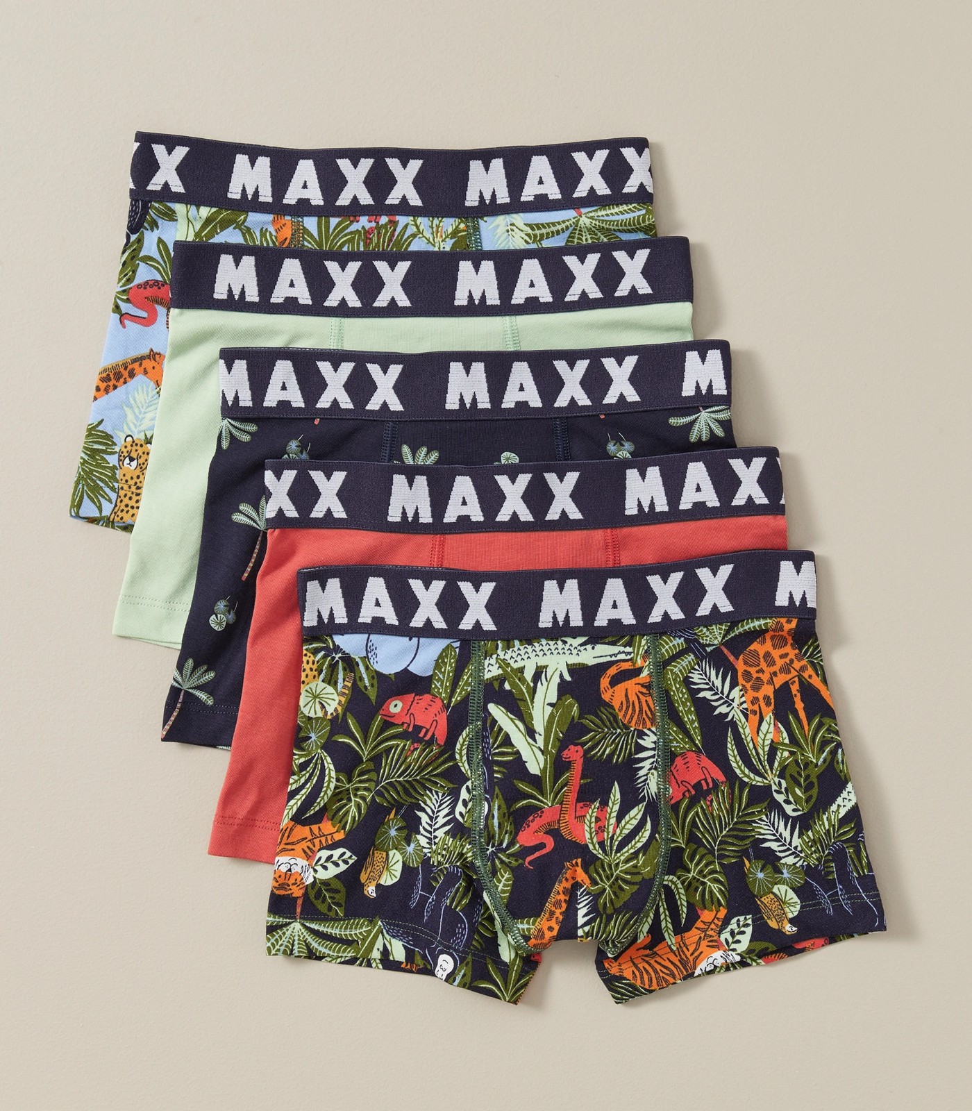 Crafted from soft cotton for all day every day comfort comes the 5 Pack Maxx Jungle Animal Trunks.