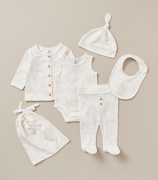 Great as a gift or for your own bubs, the 5 Piece Baby Organic Cotton Gift Set is great value multi piece set that includes a bodysuit, long sleeve top, leggings, bib and beanie and comes with a material wash bag that can double as a gift bag. All pieces are crafted from certified organic cotton that's grown free from harmful chemicals, is soft to touch and comfortable to wear.