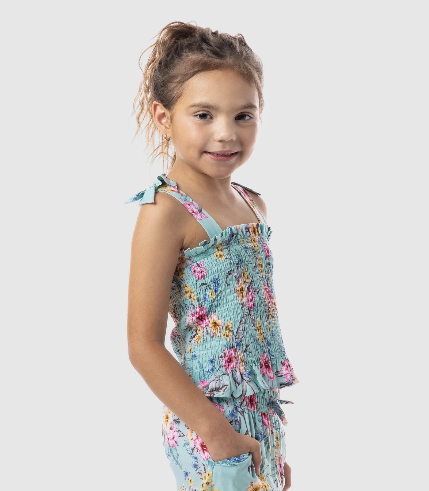 Upgrade your little girl's summer wardrobe with this delightful Piping Hot Shirred Tropical Tank. Crafted from soft and breathable viscose fabric, this tank top is perfect for keeping her cool and comfortable on hot days. The pull-on style and elasticated shirred body make it easy for her to dress independently. With its ruffle detail at the hem and neckline, this tank top adds a touch of charm to any outfit. The wide straps with bow at the shoulder add a cute and stylish element. Whether she's heading to the beach or a family picnic, she'll look effortlessly stylish in this Piping Hot tank top. Shop now and give her wardrobe a trendy update!