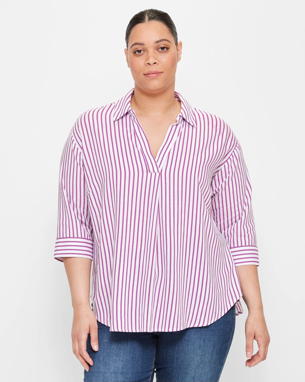 Introducing the Target Curve Pull Over Striped Shirt. This beautiful shirt is crafted from a luxurious blend of viscose and linen, giving it a soft and airy feel. It has a relaxed fit and is decorated with an all over striped print in radiant orchid and white. The pull over design features a round collared neckline with front v-drop, mid length cuffed sleeves, pleated down centre front under v-drop, and curved hemline. Perfect for warm summer days or nights out, the Target Curve Pull Over Striped Shirt will become your go-to wardrobe staple.