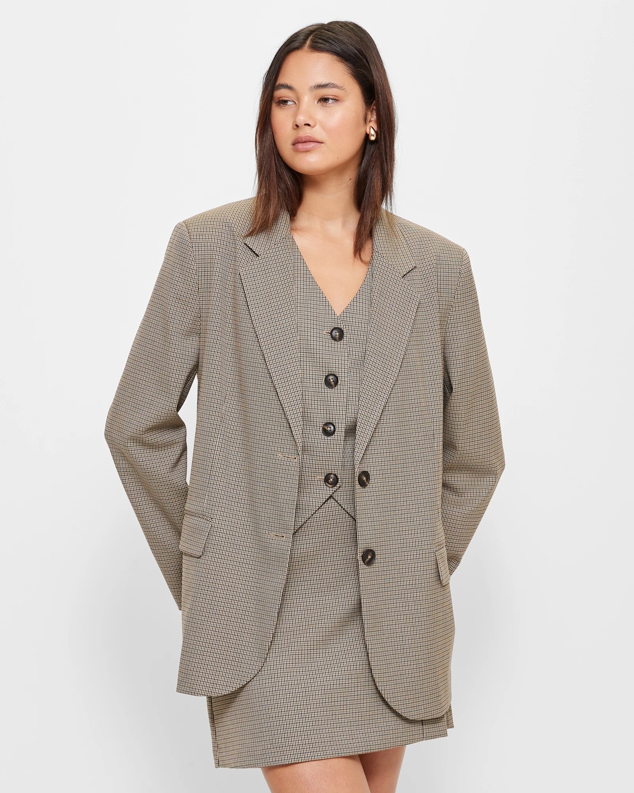 Step back in time with Lily Loves' elegant and stylish Blazer from the '90's collection. Crafted from a luxurious blend of polyester and viscose, enjoy the perfect balance of comfort and sophistication. Feel confident in its regular fit and appreciate the subtle houndstooth pattern. Embrace the structured silhouette with slightly padded shoulders and button cuffs. Ideal for any occasion, the blazer features front lapels, pockets, and a split at the back for ease of movement. Elevate your wardrobe with the timeless charm of the '90's Blazer.