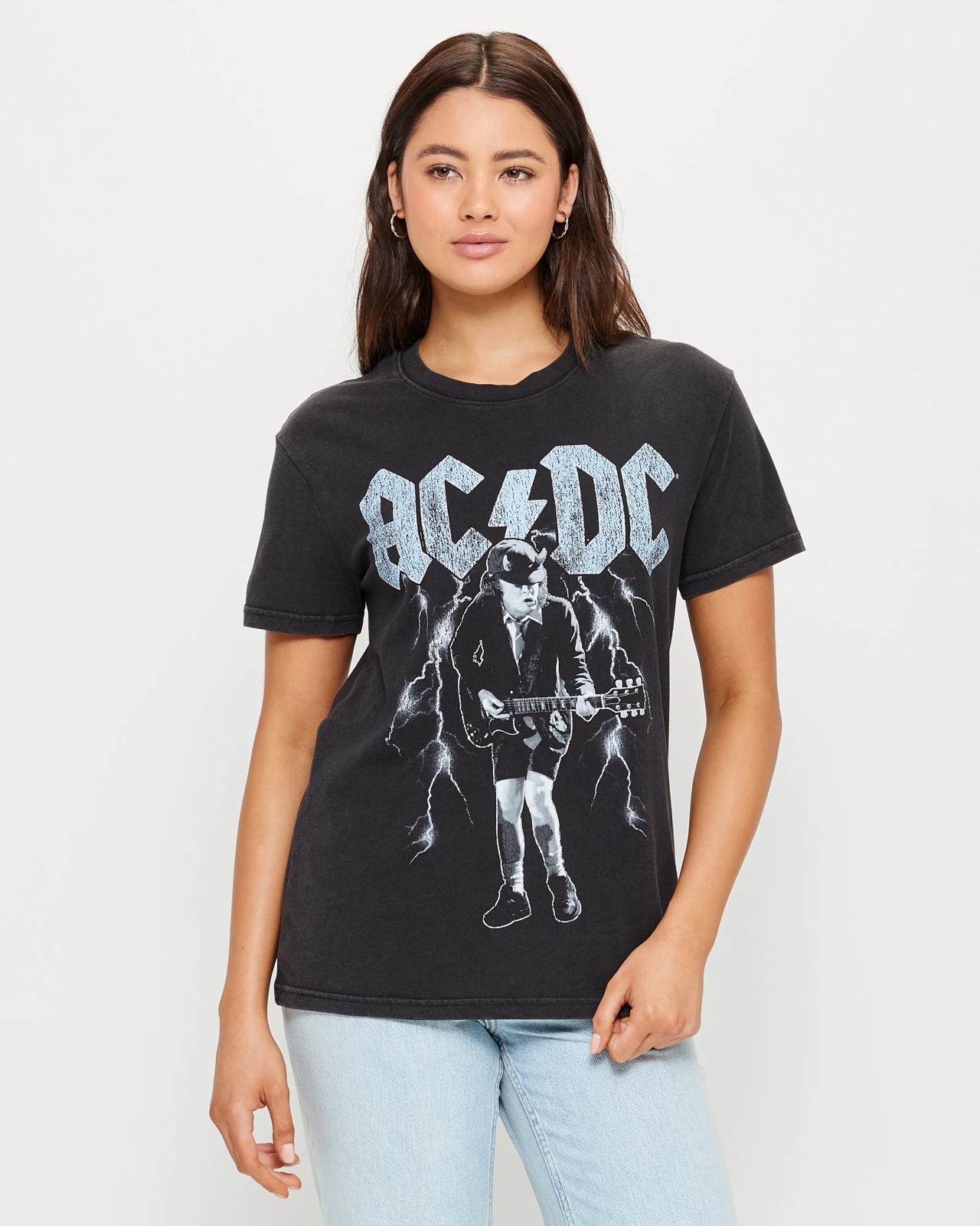 Bold front print of Angus from AC/DC with wording AC/DC