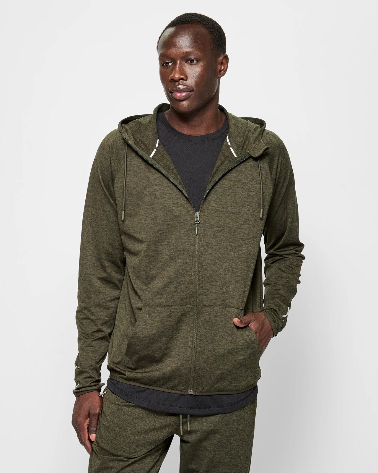 Step up your activewear game with this stylish Active Panelled Hoodie. Perfect for outdoor activities or a casual day out, this hoodie features a round high neckline with a hood, eyelets, and a drawstring for added comfort. Made from a soft, lightweight polyester blend, it ensures you stay dry with its moisture-wicking properties. The khaki green hue adds a trendy touch, while the regular fit and long sleeves with thumb cut-outs make it ideal for any kind of movement. Complete with a zip-through front, a front kangaroo pocket, and a metallic logo on the wrist, this hoodie is functional and fashionable. Don't miss out – make this versatile piece a staple in your wardrobe today!