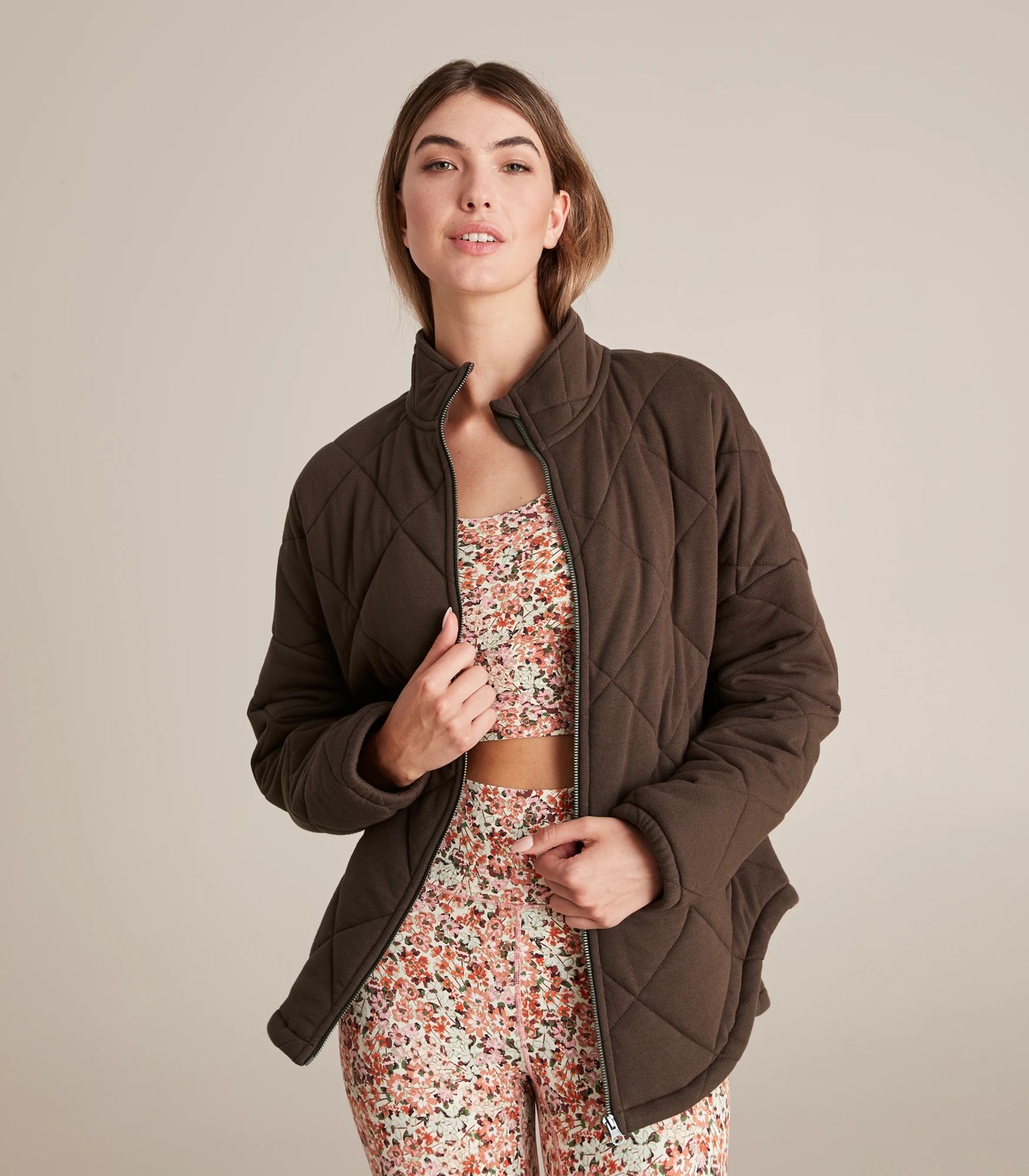 The perfect winter coverup as you workout outside, the Active quilted jacket features a thick cotton rich quilted design, a high funnel neckline for coverage and long sleeves for warmth.