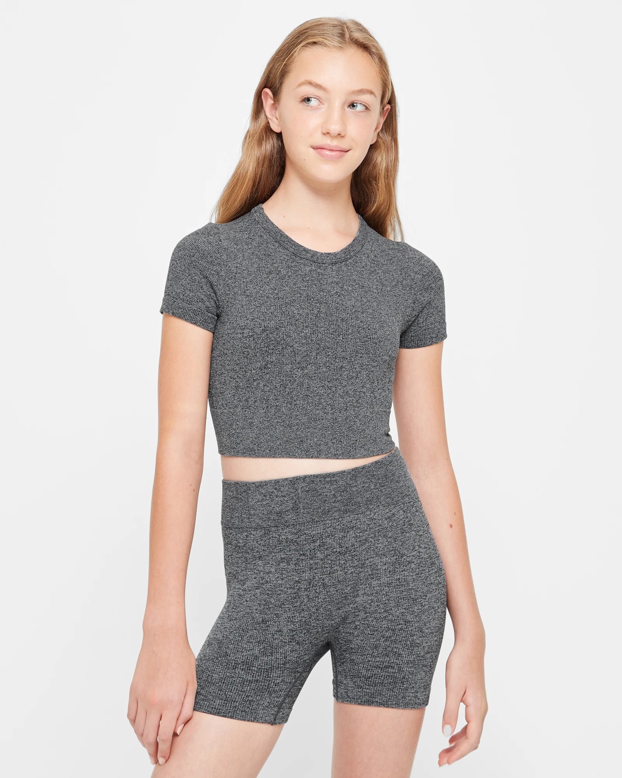 Introducing our new Active Seamfree T-shirt for girls. Crafted using recycled materials, this top is not only stylish but also environmentally friendly. It features a cropped fit and a sleek charcoal marle design, perfect for any active girl. The crew neck and short sleeves provide comfort and flexibility, allowing for easy movement during any activity. The straight hem adds a modern touch to the overall look. Complete the set by pairing it with our matching bike shorts, available and sold separately. Get ready to stay active and trendy with this must-have piece. Upgrade your wardrobe and make a positive impact on the environment today!