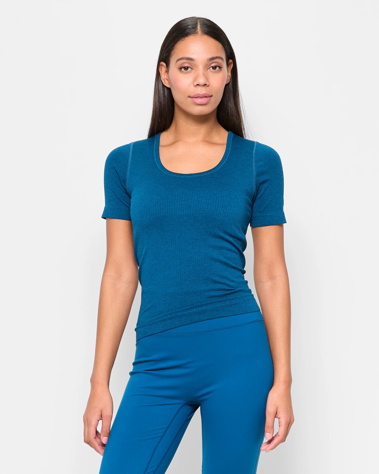 The Active Studio Ribbed T-Shirt with Shelf Bra is designed to support your active lifestyle and give you confidence on the move. Its soft ribbed texture and smooth inner lining feel gentle against your skin, while the built-in shelf bra with removable cups gives comfortable support without any wires. The moisture-wicking fabric keeps you cool and dry, even during intense workouts. Featuring a classic scoop neckline, regular fit, and short sleeves, this top blends sporty design with casual ease. Choose this tee for an effortless and supportive fit, whether you are at the gym or enjoying some downtime, and let your style shine through every activity.