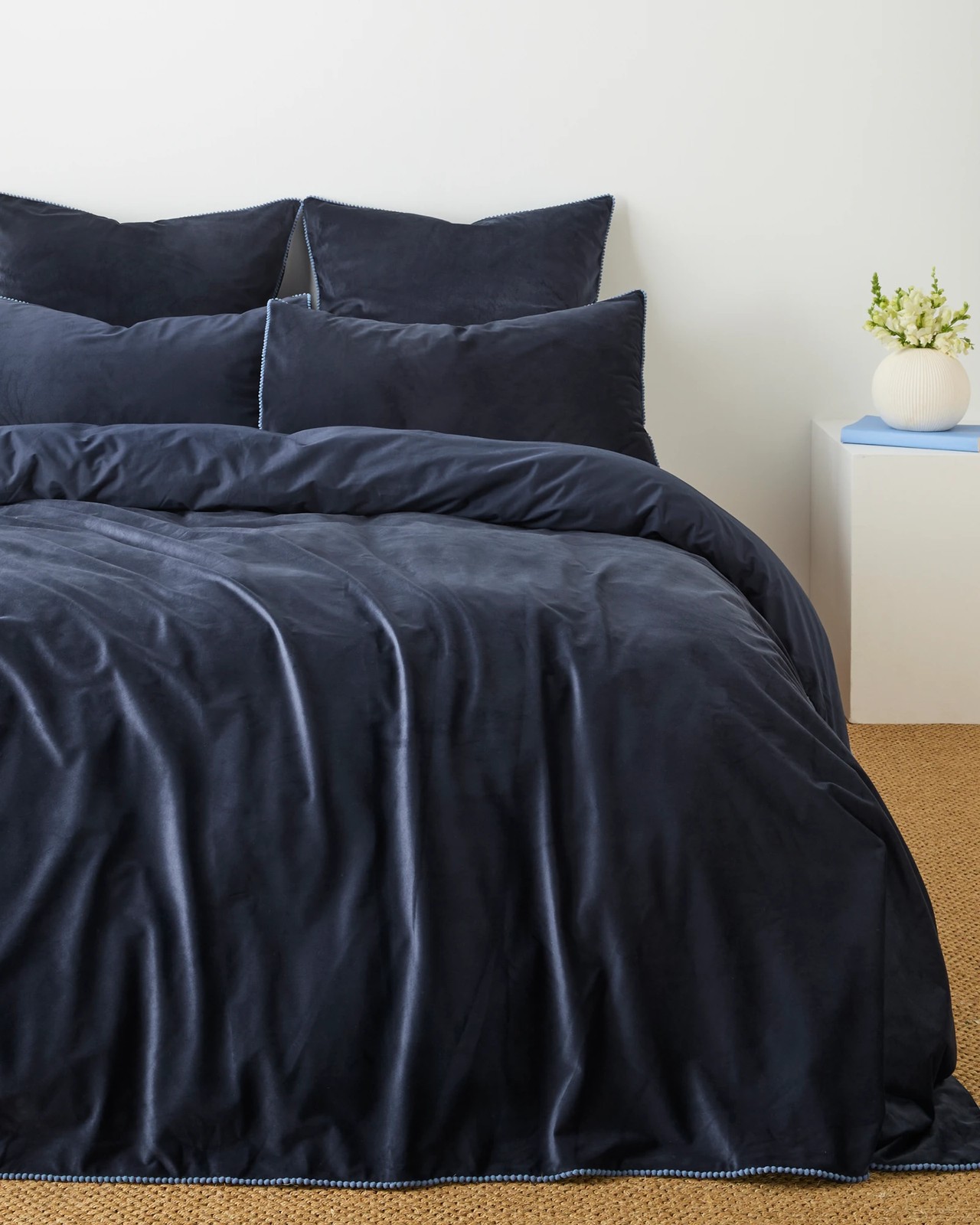 Experience the lavish comfort of the Alia Velvet Quilt Cover Set in an enchanting shade. This set combines a velvety polyester front with a comfortable cotton reverse, ensuring a soft and snug feel. Featuring charming pom pom trimmings, it adds a refined touch to your bedroom décor. The set is conveniently machine washable and designed for Queen, King, and Super King sizes, including a quilt cover and two pillowcases. Pair it with the matching Alia Velvet European Pillowcase, available separately. Enhance your sleep quality with this sophisticated and cosy addition to your bedding.