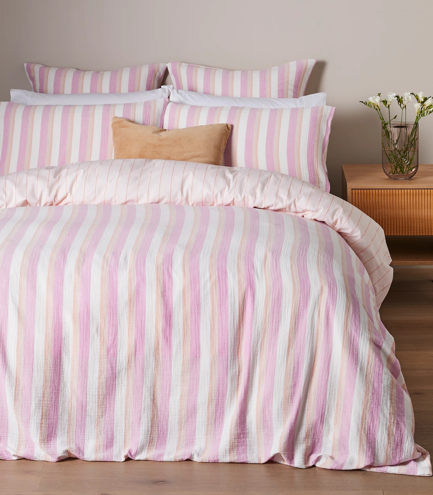 Experience the ultimate comfort and style with our Alva Resort Stripe Quilt Cover Set. Crafted from breathable and durable cotton, this set offers a luxurious feel that you'll love. The soft muslin layered fabric adds a beautiful texture to your bedroom decor. Made using natural fibres, it is not only environmentally friendly but also perfect for those with sensitive skin. Elevate your bedding ensemble and create a tranquil retreat with our Alva Resort Stripe Quilt Cover Set.