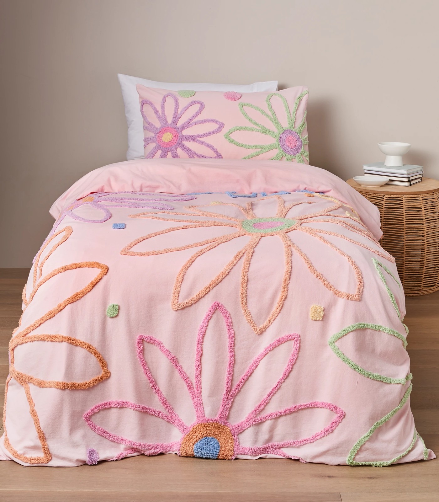 Brighten up your child's bedroom with the Amelia Tufted Kids Quilt Cover Set! This fun and playful set is made from 100% cotton in a vibrant pink colour with tufted flower design. The tactile texture creates an inviting feel for your little one's special place, making sure they drift off to dreamland in comfort and style. Each set includes one quilt cover and matching pillowcase/s to give you the complete look for your kid's bedroom.
