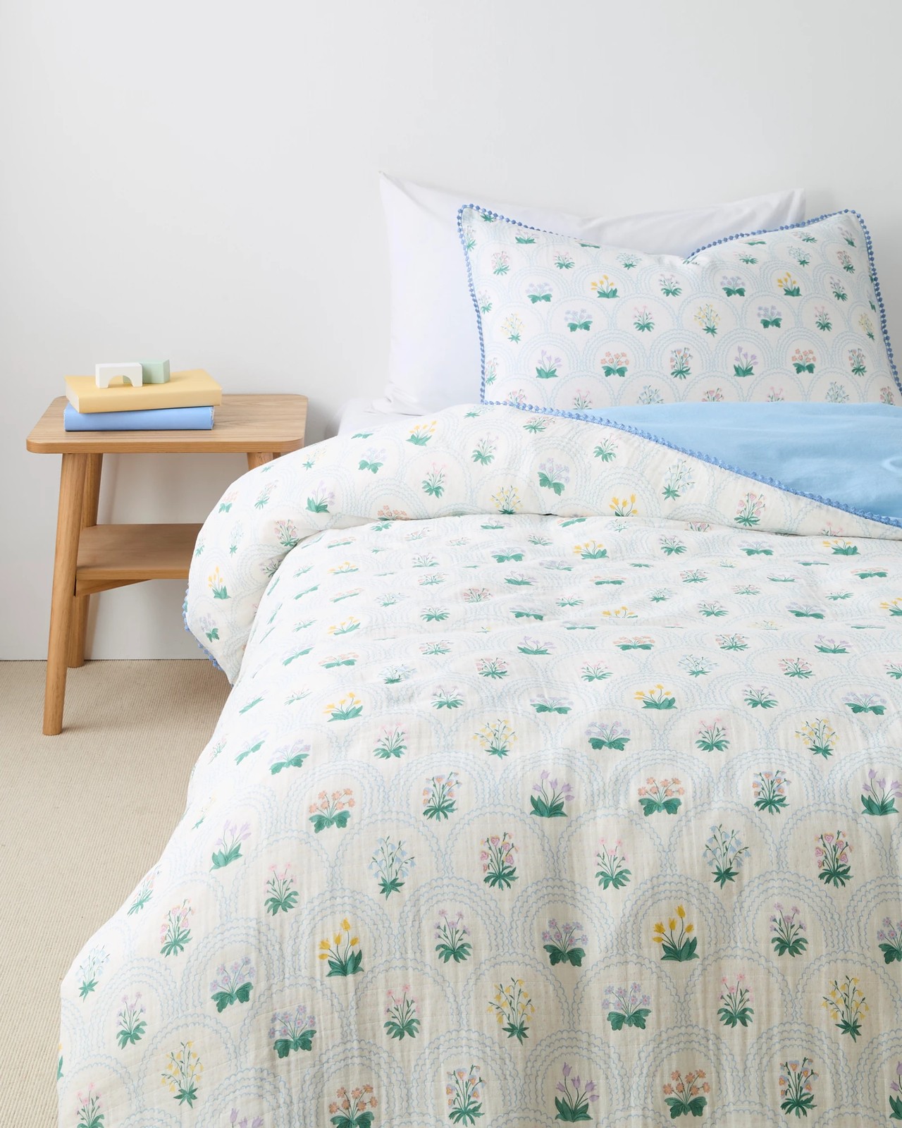 Experience comfort and style with the Anabelle Ditsy Floral Muslin Quilt Cover Set. Made from Australian cotton, this set showcases a muslin texture coupled with a beautiful floral pattern on the front and a calming blue on the reverse side. The set is finished with a neat trim edge and is conveniently machine washable, making it an easy addition to your bedding collection. Refresh your bedroom and enjoy the relaxed, inviting atmosphere this quilt cover set provides.
