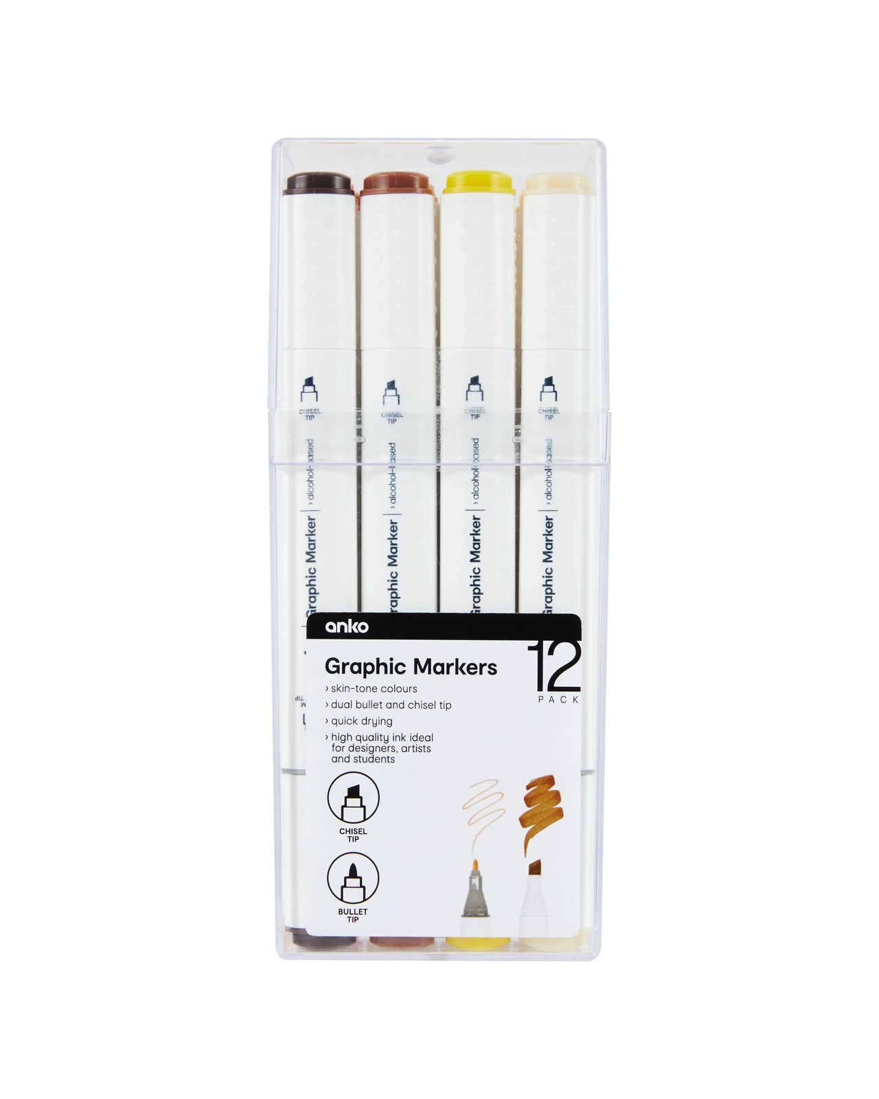 Unlock your artistic talents with the Anko 12 Pack Graphic Markers, designed for designers, artists and students ready to add flair to their work. Each marker features both bullet and chisel tips, so you can effortlessly switch between detailed lines and bold coverage. An inspiring range of skin-tone shades is perfect for those who love to blend and explore portraits or everyday sketches. The quick-drying ink helps keep your pages neat, letting you enjoy smooth application with every stroke. Enjoy greater versatility in your projects and discover a new favourite tool. Make your creations stand out—add this impressive set to your collection now.
