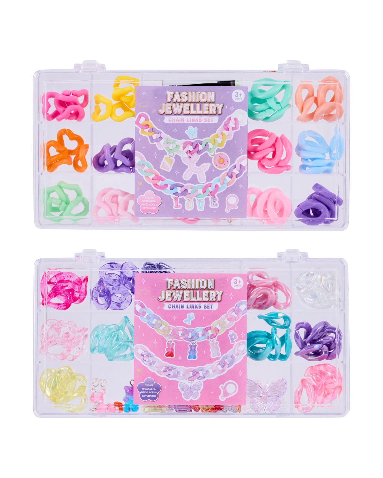 Spark your child's imagination with the Fashion Jewellery: Chain Links Set. This charming kit makes creating unique bracelets, necklaces, and keychains a delightful adventure. Inside each set, children will find bright, colourful links, cheerful beads, charms and easy-to-use clips, all neatly stored in a handy carry case. Kids can personalise their own jewellery, mix and match pieces, and proudly wear their handmade accessories or share them with friends. Perfect for solo play or group activities, this set encourages creative confidence and fine motor skills. Give the gift of self-expression and lasting memories—pick up a Chain Links Set today and let your little one’s creativity shine.
