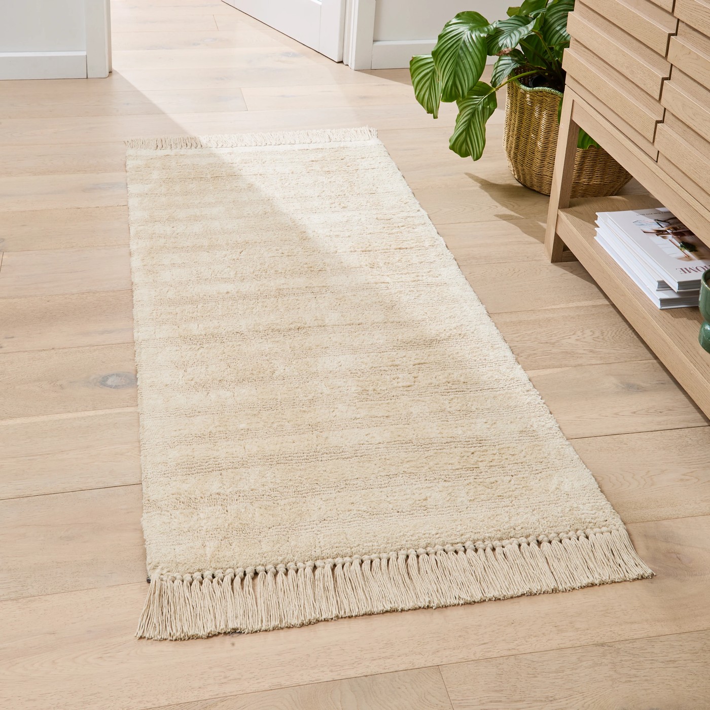 Transform your room with the Anko Nina Woven Rug in classic beige. Its beautifully woven surface brings warmth and inviting charm to your living space while the soft finish feels delightful beneath your feet. The small, rectangular design fits effortlessly into bedrooms, hallways or smaller areas. Featuring a carpet-backed base for extra support and playful tassel details, this rug instantly adds character. Easy to care for and simple to vacuum, it is a wonderful way to introduce cosiness and personality to any setting. Treat your home to softness and style with this eye-catching woven rug today.