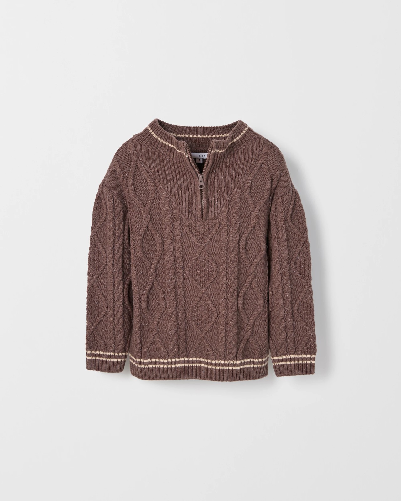 Treat your child to comfortable, easy-going style with the Australian Cotton Blend 1/4 Zip Knit Jumper. Made with a thoughtful mix of cotton, recycled nylon, and wool, this jumper feels soft against the skin while keeping your little one cosy on cooler days. The standing collar and practical quarter zip offer flexibility—zipped up for chilly outings or open for more laid-back moments. Long sleeves and ribbed details at the cuffs and hem ensure a snug fit, ideal for both playtime and family meet-ups. Choose this jumper for a reliable blend of quality and classic appeal—add it to your basket and let your child enjoy snug comfort and timeless charm.