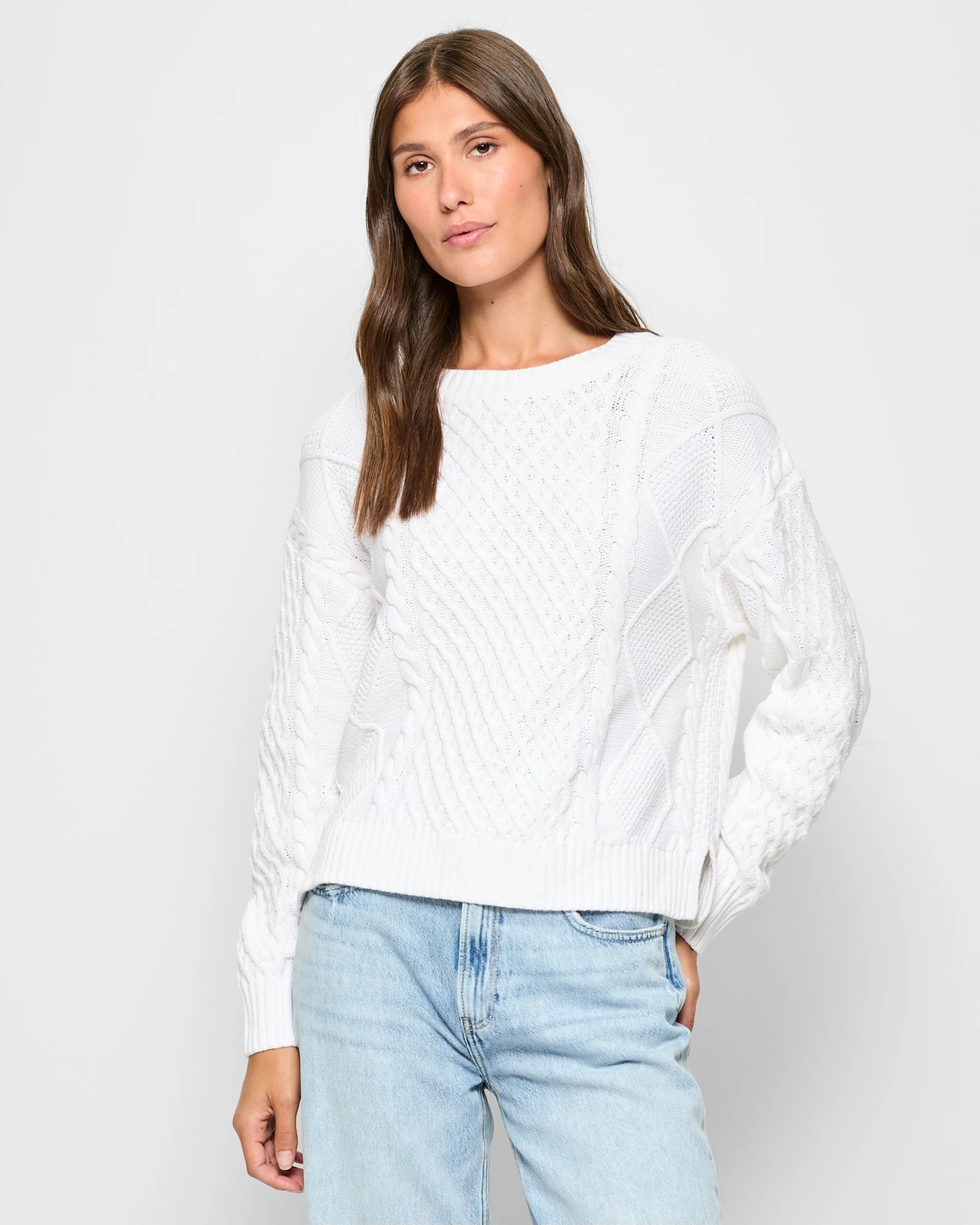 Indulge in the comfort and style of our Australian Cotton Blend Cable Knit Jumper. This women's jumper, made from a high-quality blend of cotton and acrylic, features the finest Australian cotton. The stunning all-over cable knit pattern will enhance your wardrobe. Designed with a regular fit, it includes a ribbed crew neckline, long ribbed cuff sleeves, and a straight ribbed hemline with side seam splits. Make it your staple for a cosy yet fashionable look. Don’t miss out on owning this versatile addition to your collection.