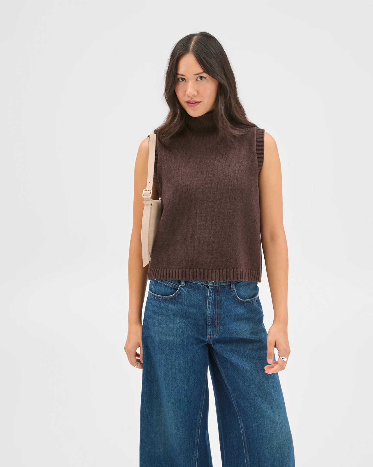 Australian Cotton Blend High Neck Long Sleeveless Vest - Brunette