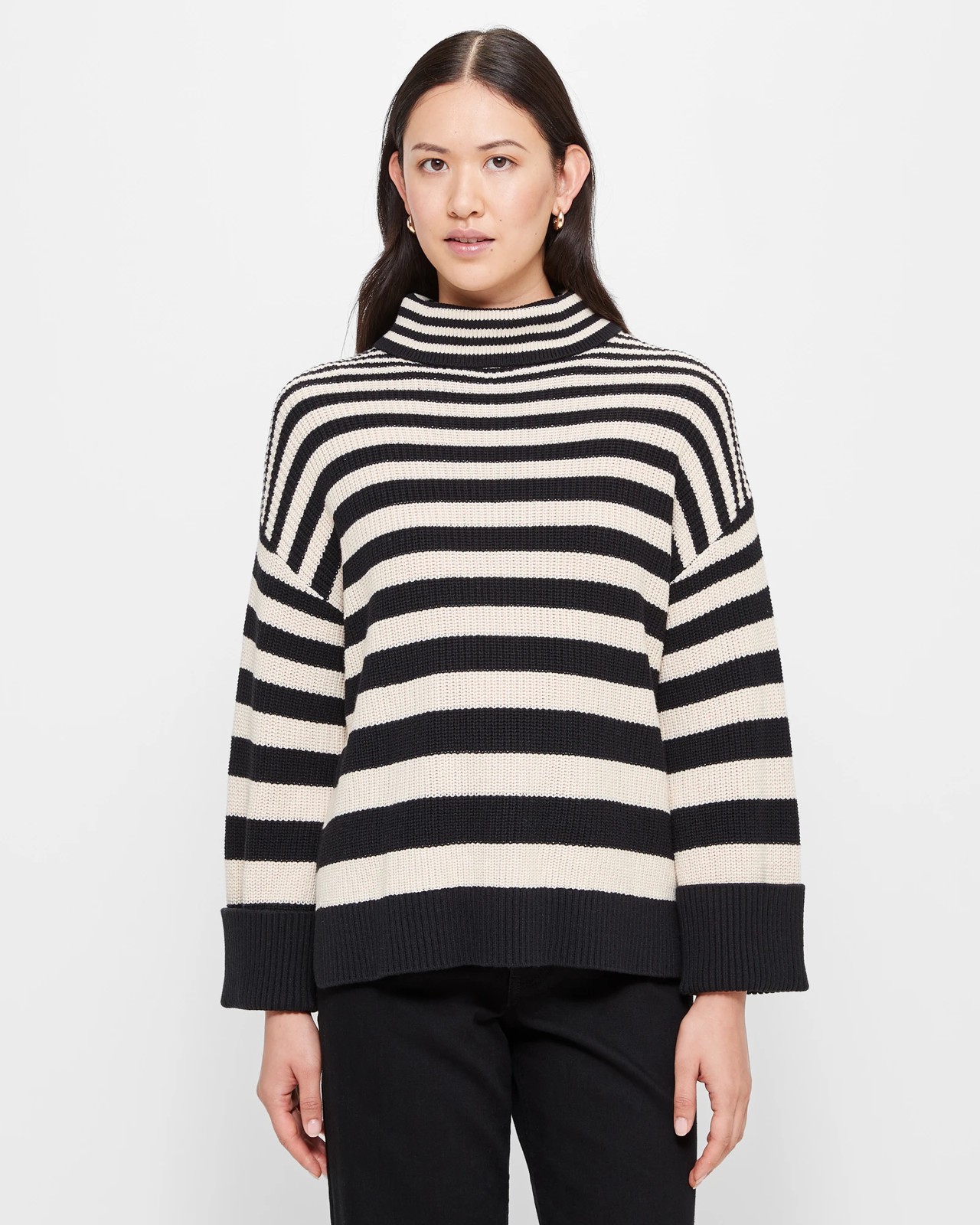 Introducing our Australian Cotton Blend Knit Roll Neck Jumper for women. This jumper is made from a luxurious blend of Australian cotton and acrylic, providing ultimate comfort and style. The all-over knit design adds a touch of elegance to the jumper, while the black/cream stripe pattern adds a modern twist. With its regular fit and round roll over neckline, this jumper is perfect for any occasion. The long roll cuff sleeves and thick straight hemline ensure a snug fit and maximum warmth. Pair it with your favourite jeans or skirt for a stylish and cosy look. Upgrade your wardrobe with our Australian Cotton Blend Knit Roll Neck Jumper and experience the ultimate comfort and style. Shop now and elevate your fashion game!