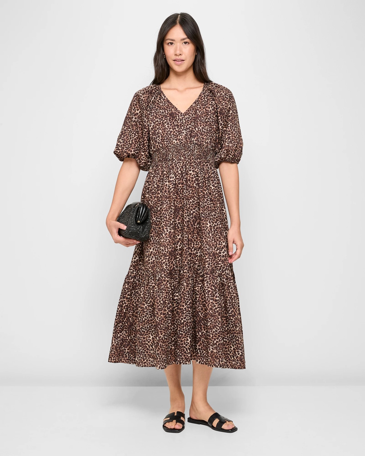 Enjoy the perfect blend of comfort and style with our Australian Cotton Blend Long Sleeve Tiered Midi Dress. Designed with Australian cotton, this dress ensures a light and breathable feel, making it your go-to piece year-round. The eye-catching leopard spot print adds a touch of fun while the round elastic neckline with a front v-drop provides a unique touch. Featuring 3/4 length sleeves with elastic cuffs and a shirred waistband, this dress offers both ease and charm. The large tiered panel at the lower part of the dress brings a flowing shape, making it ideal for any event. Add this versatile midi dress to your collection and be ready for any occasion.