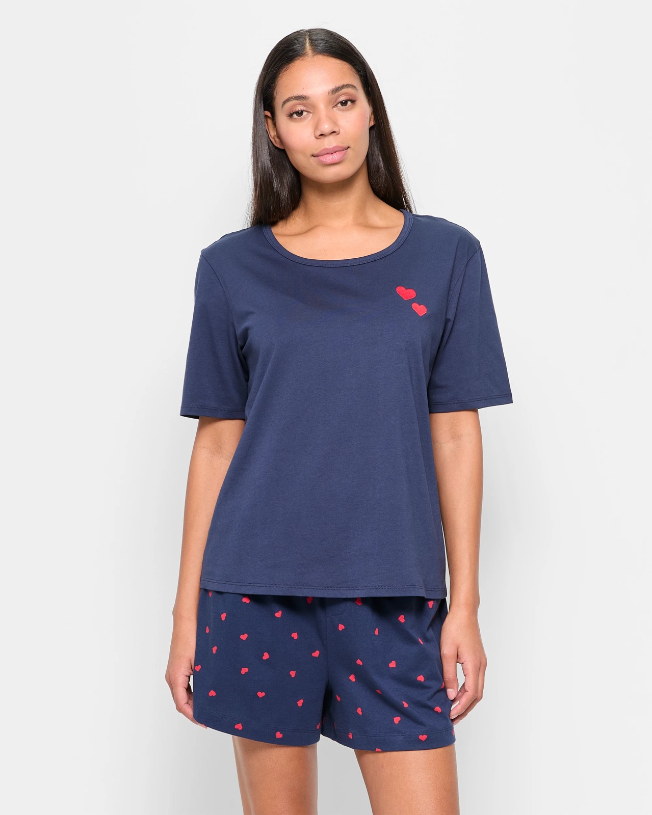 Indulge in comfort with our Australian Cotton Blend Print Sleep Top. Made from a cosy cotton and polyester combination, this sleep tee ensures a soft and breathable experience. Showcasing a delightful small print on the chest, it features short sleeves and a snug ribbed crew neckline. The relaxed fit and airy fabric make it perfect for a peaceful night's sleep. Complete your nightwear collection by pairing it with our matching sleep pants.