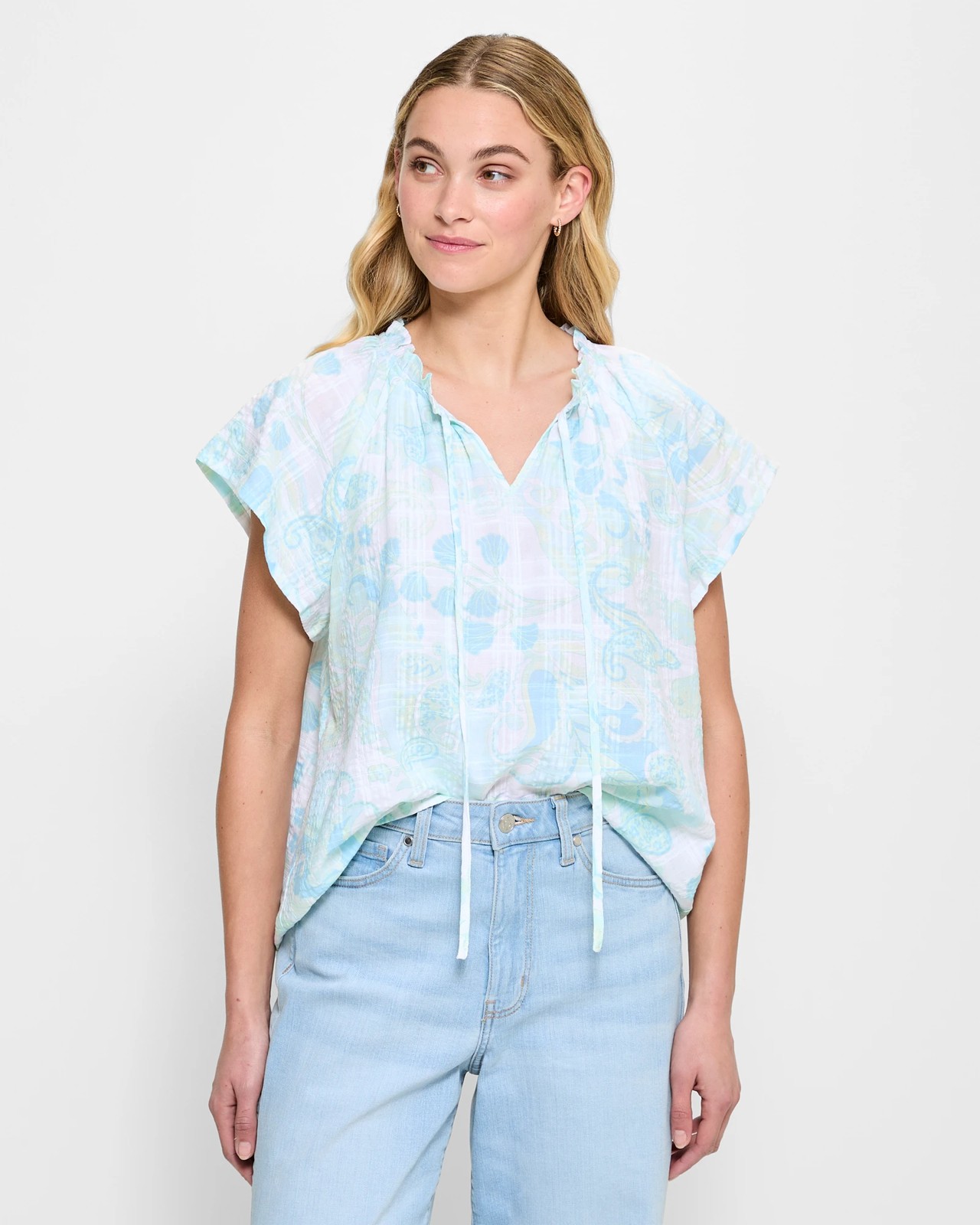 Experience the perfect blend of comfort and style with this Australian Cotton Blend Raglan Flutter Sleeve Top. Featuring a soft and breathable fabric, this top ensures you stay cool and at ease all day. The attractive Blue Lovejoy colour combined with all-over textured stripes creates an appealing look. Designed with short flutter sleeves and a rounded neckline adorned with a delicate frill and keyhole tie, this top is ideal for both casual and semi-formal occasions. Enjoy a laid-back yet chic style with this versatile piece.