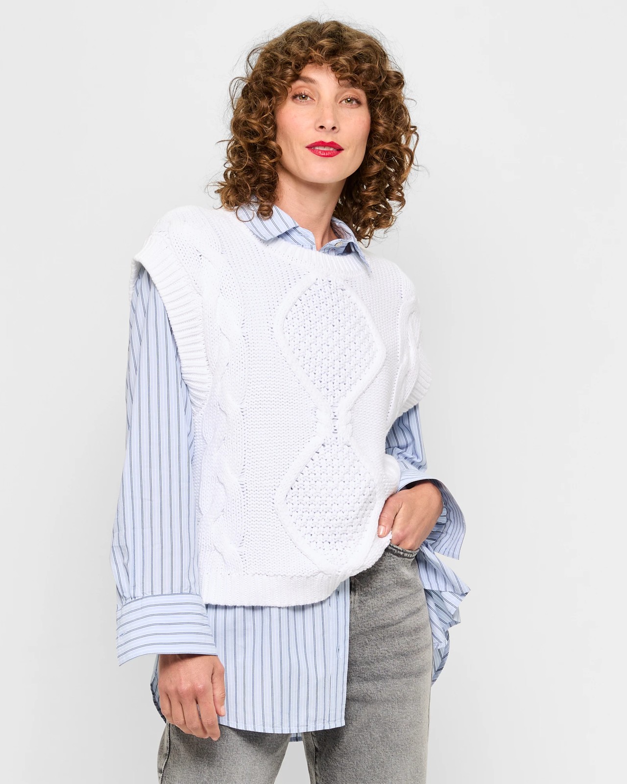This charming sleeveless cable knit vest is made from soft, comfortable cotton. Its light and airy design is perfect for adding layers or wearing solo. The timeless cable knit pattern and ribbed crew neckline enhance any attire. Featuring a regular fit with substantial ribbed armholes and hemline, it's both chic and practical. Refresh your wardrobe with this versatile piece!
