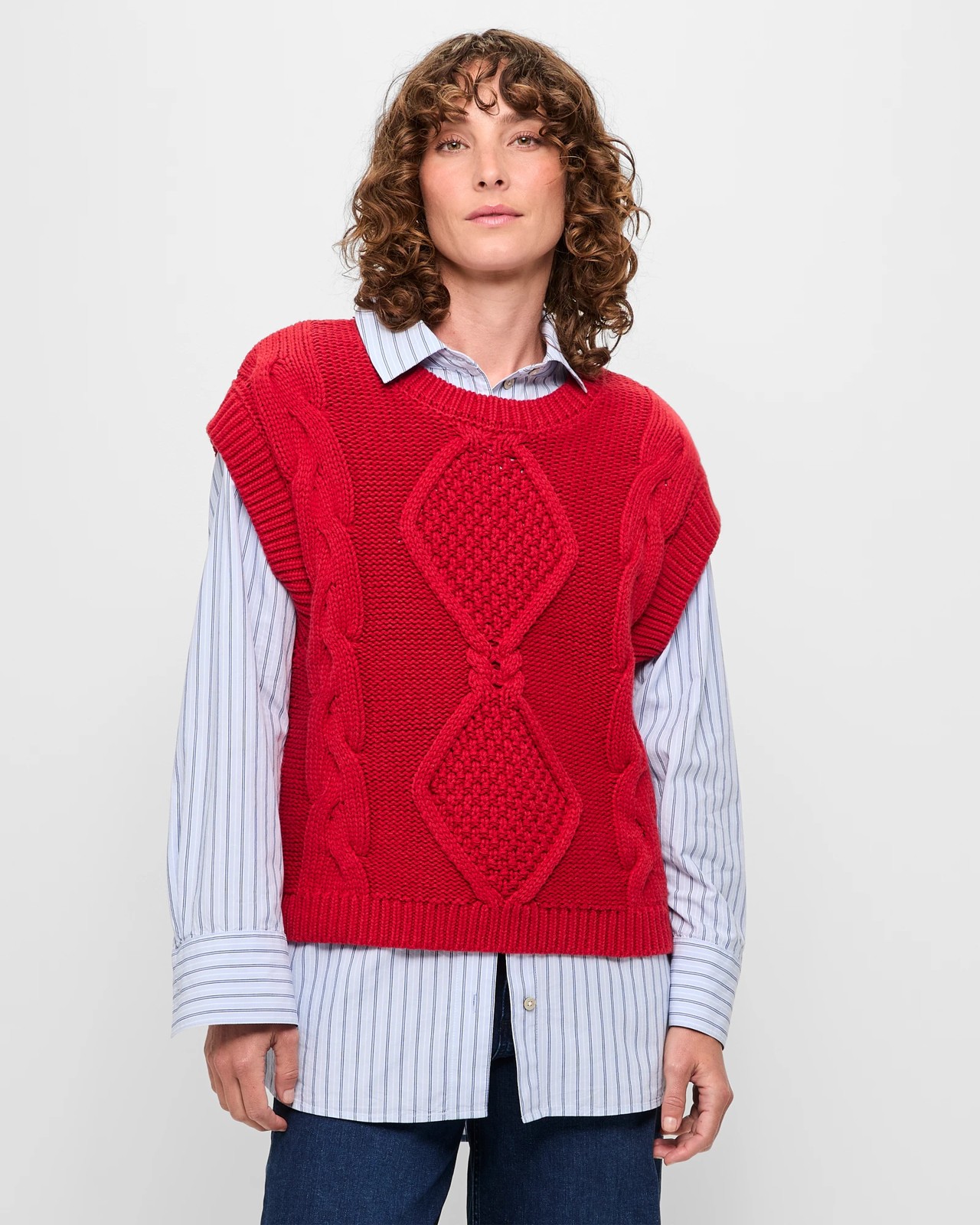 This charming sleeveless cable knit vest is made from soft, comfortable cotton. Its light and airy design is perfect for adding layers or wearing solo. The timeless cable knit pattern and ribbed crew neckline enhance any attire. Featuring a regular fit with substantial ribbed armholes and hemline, it's both chic and practical. Refresh your wardrobe with this versatile piece!