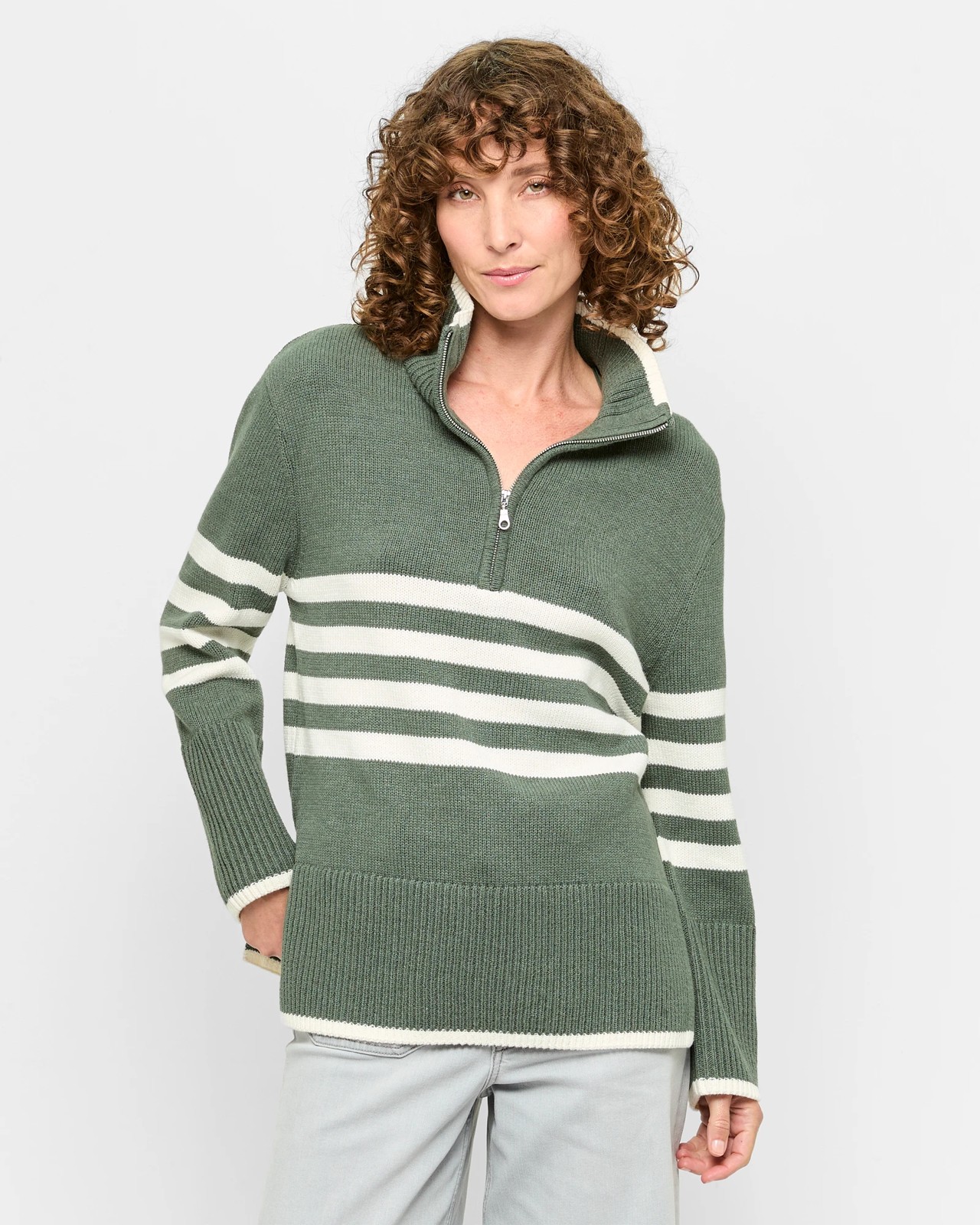 Step into cosy style with our Australian Cotton Blend Zip Collar Jumper. Created from a mix of cotton and acrylic, this jumper offers the perfect balance of comfort and airiness. The all-over knit design, complemented by khaki marle and whisper white stripes, exudes a timeless charm. Featuring a ribbed high neckline with a quarter zip, long cuffed sleeves, and a relaxed fit, this piece is perfect for layering on chilly days. Make it yours today and experience effortless style and warmth!