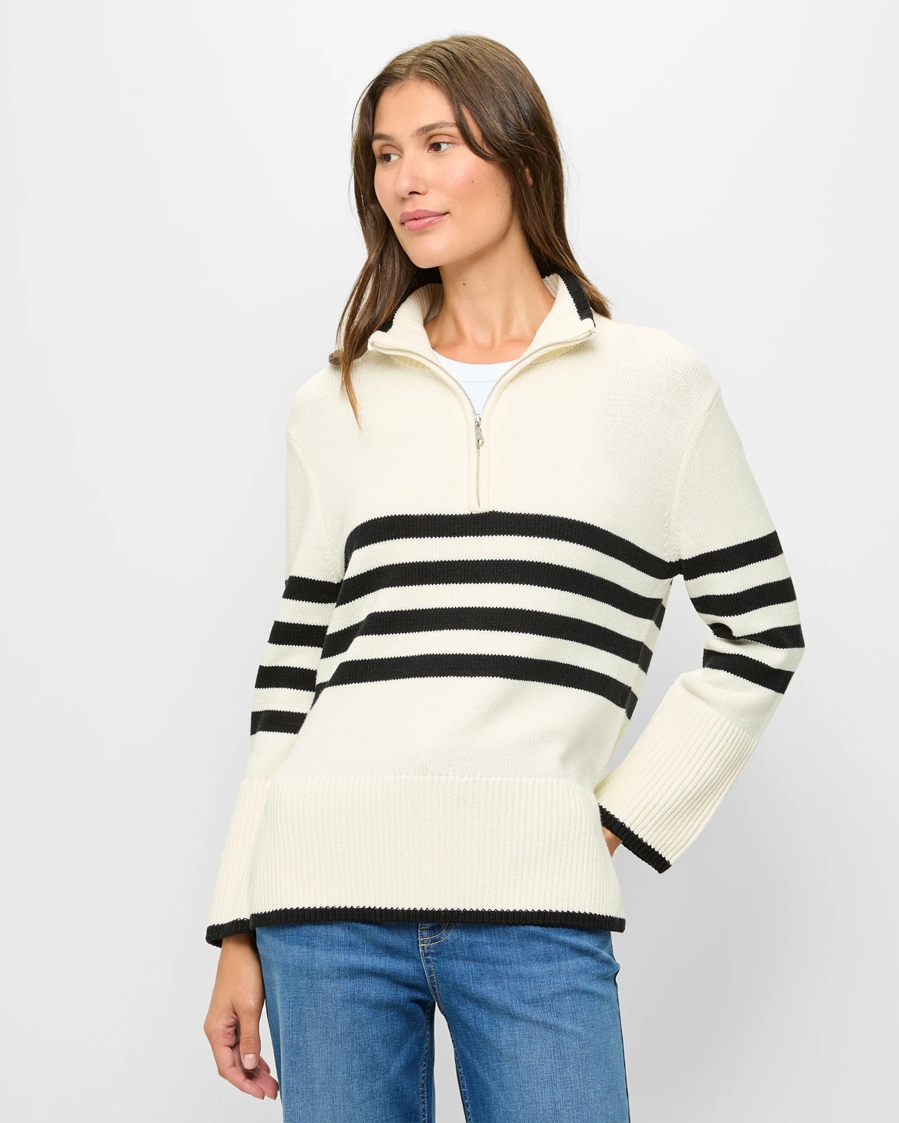 Experience effortless style with our Australian Cotton Blend Zip Collar Jumper. Made from a high-quality cotton and acrylic blend, this jumper features a timeless knit design and a sophisticated whisper white and black stripe pattern. Designed for ultimate comfort, its relaxed fit and soft fabric make it perfect for everyday wear. The quarter zip front allows for versatile styling, while the long ribbed cuff sleeves and straight hemline with side seam splits add a touch of charm. Embrace the cosy vibes and step out in style - add this jumper to your wardrobe today.