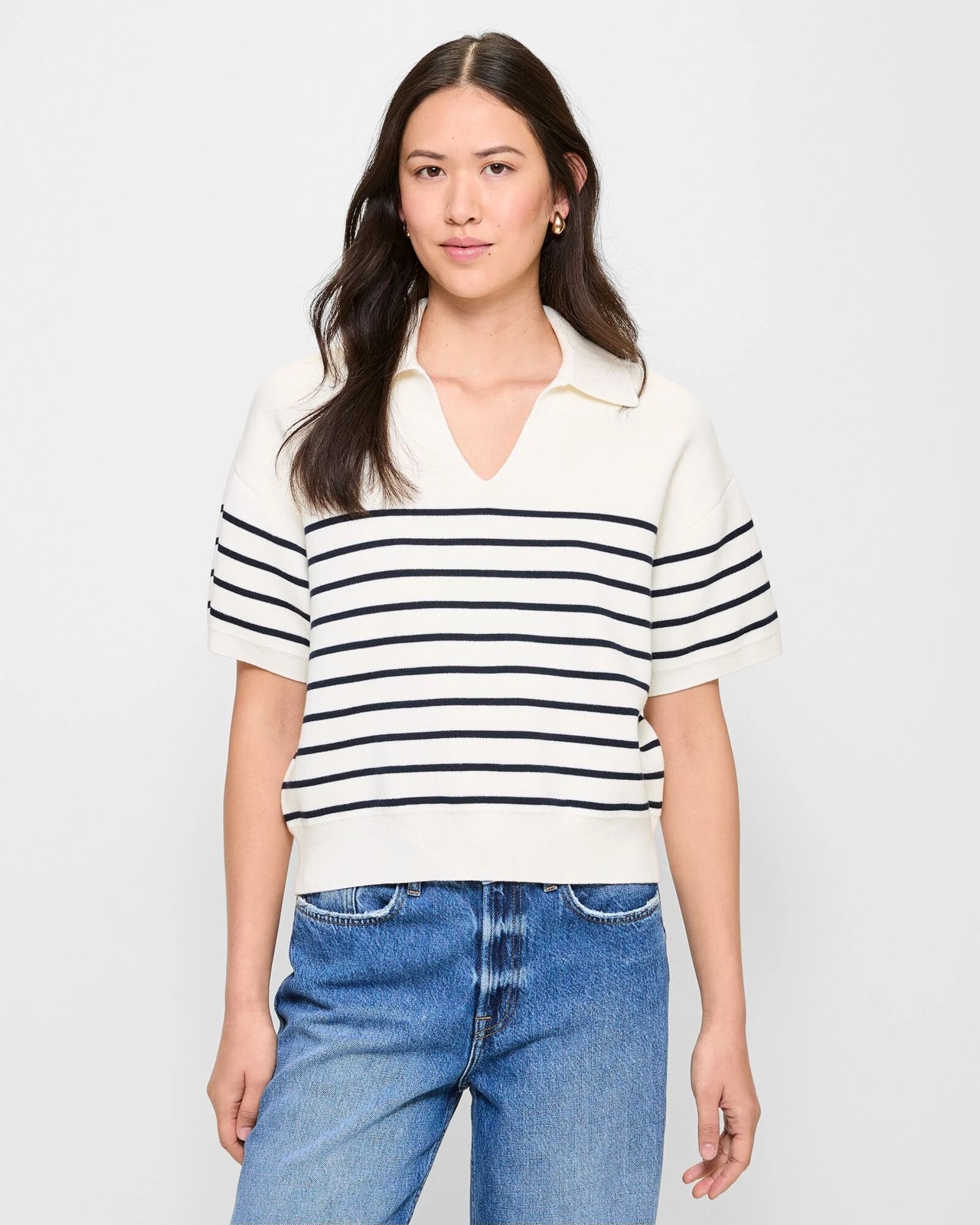 Experience the charm of our Australian Cotton Breton Stripe Knit Polo Top. This top is made from a comfortable cotton that provides just the right amount of breathability. The white and navy stripe pattern offers a classic look, while the round ribbed collared neckline with a V-front drop adds a stylish touch. Featuring short ribbed cuff sleeves and a thick ribbed hemline, this piece is perfect for everyday wear. Make it a staple in your wardrobe today.
