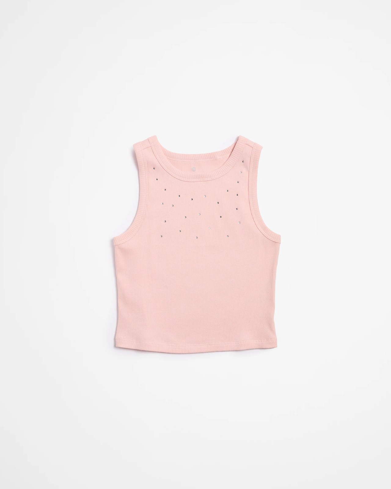 Upgrade your wardrobe with our Australian Cotton Diamonte Rib Tank. This tank for girls ensures a snug fit and excellent stretch, delivering all-day comfort. The diamonte embellishments on the crew neck add a hint of sparkle, perfect for casual outings. Made from high-quality Australian cotton, this sleeveless top also features a chic straight hem. Add a touch of style and ease to your collection – order yours now.