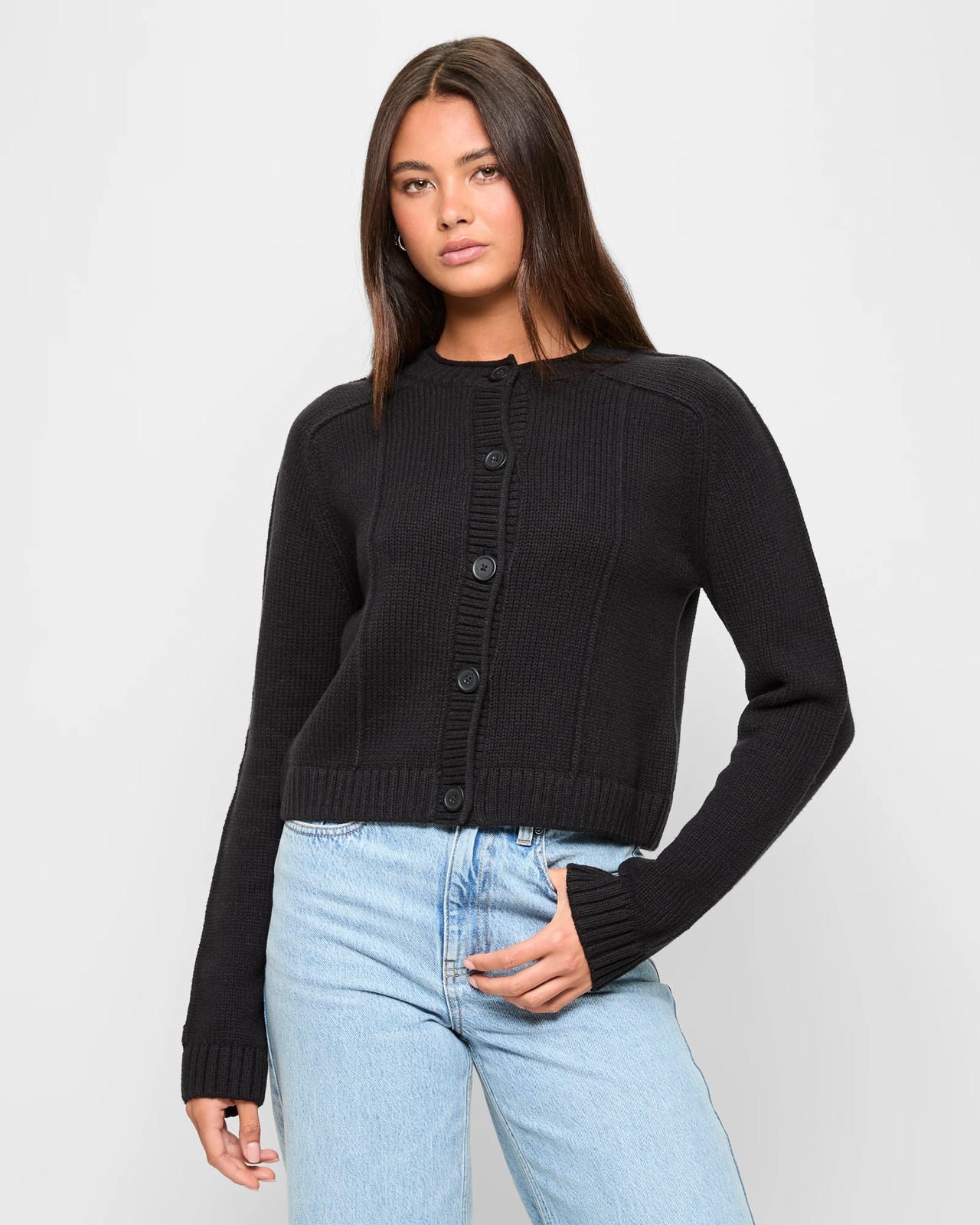 Experience the perfect combination of style and ease with this Lily Loves cardigan. Made from a breathable blend of Australian cotton and acrylic, its regular fit and all-over knit design offer comfort for every occasion. Featuring a crew neckline with a rolled top, button front, and long ribbed cuffs, this cardigan stands out with its exposed seams and short length. Embrace the charm and versatility that this wardrobe essential brings to your outfits.