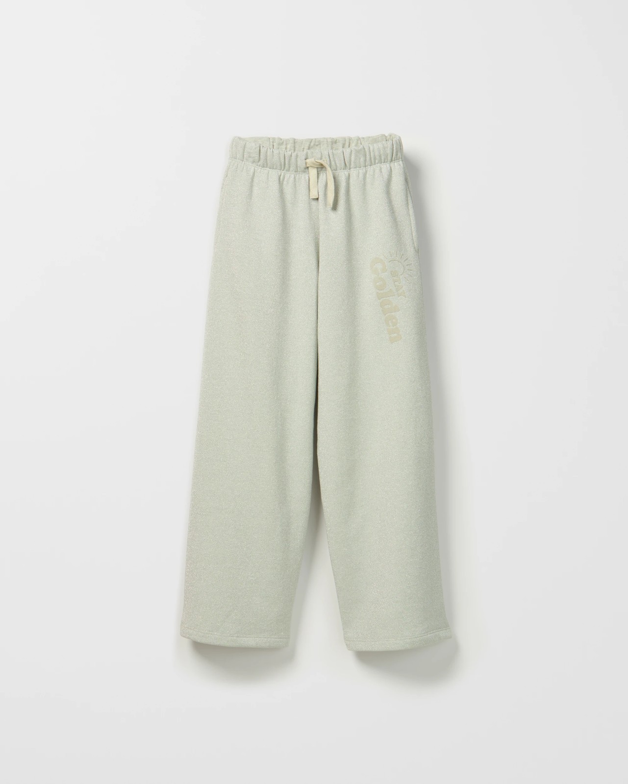 Slip into comfort and style with our Australian Cotton Glitter Trackpants. Made from soft, breathable Australian cotton, these trackpants feature a relaxed fit and a touch of sparkle with their glittery fabric. The elastic waistband with a drawcord ensures a snug fit, while practical side seam pockets offer convenience. With a raised print detail on the thigh and comfortable wide legs, these are perfect for both lounging and casual outings. Pair them with the matching jumper for a complete look. Don’t miss out on this blend of comfort and fashion!