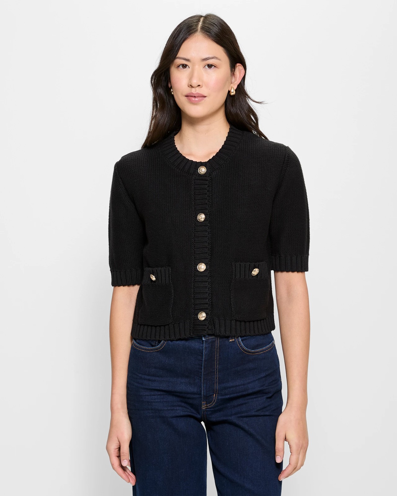 Fall in love with the comfort of our Australian Cotton Knit Cardigan. This women's cardigan, made from Australian cotton, offers a light and airy feel perfect for any season. Featuring an all-over knit design, it boasts a regular fit, a round ribbed neckline, and short ribbed cuff sleeves. The decorative gold buttons and practical front open pockets add a touch of charm and functionality. With its straight ribbed hemline and shorter length, this cardigan is a stylish addition to any wardrobe. Add it to your collection and enjoy a blend of style and ease.