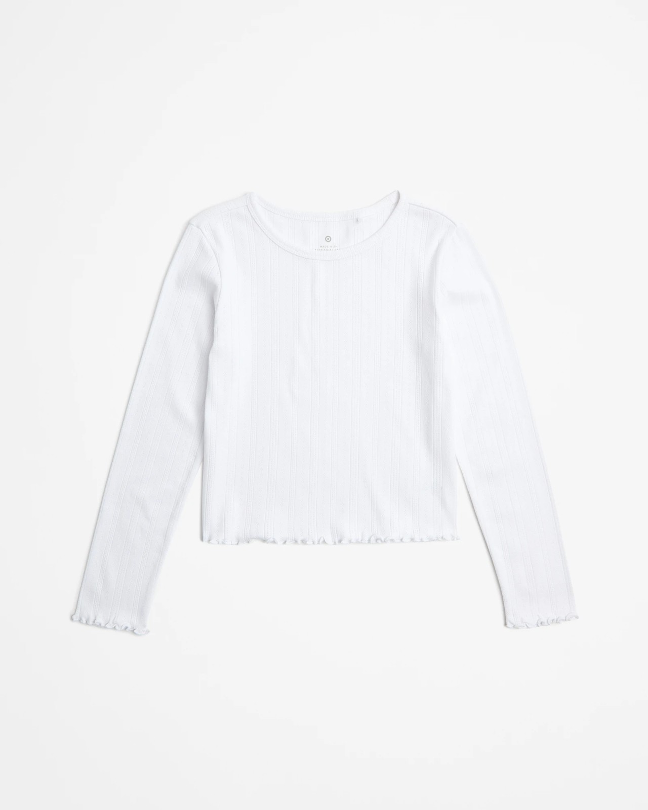 Dress your little one in comfort and style with our Australian Cotton Long Sleeve Pointelle Top. Made from high-quality cotton, this top ensures softness throughout the day, perfect for any activity. The charming pointelle pattern adds a touch of finesse, while the regular fit and crew neck guarantee an easy wear. Featuring long sleeves with delicate lettuce cuffs and a straight hem, this top brings a playful yet refined look to her wardrobe. Make this versatile piece a staple in her collection.