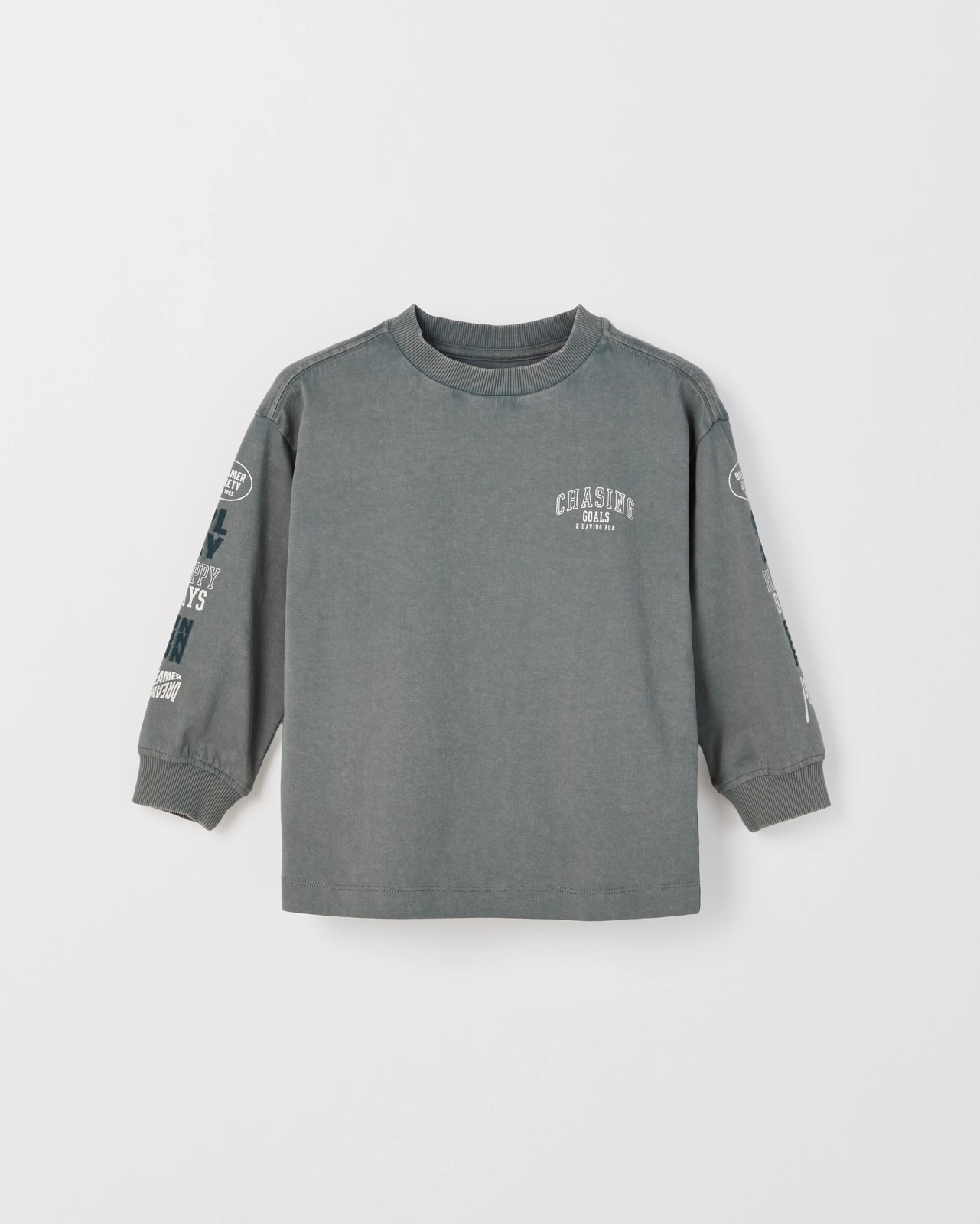 Let your child step out in style with this Australian Cotton Long Sleeve Washed Print T-Shirt. Made using Australian cotton for a soft, gentle feel, this tee is designed for comfort throughout the day. The relaxed regular fit, combined with drop shoulders, creates a fashionable yet laid-back look your child will love. The eye-catching acid wash effect adds flair, while bold prints across the chest, sleeves and back give this shirt loads of personality. Ribbed cuffs and a stretchy crew neck help the t-shirt stay in place for every adventure. Encourage confidence and self-expression—pick up this versatile wardrobe favourite today.