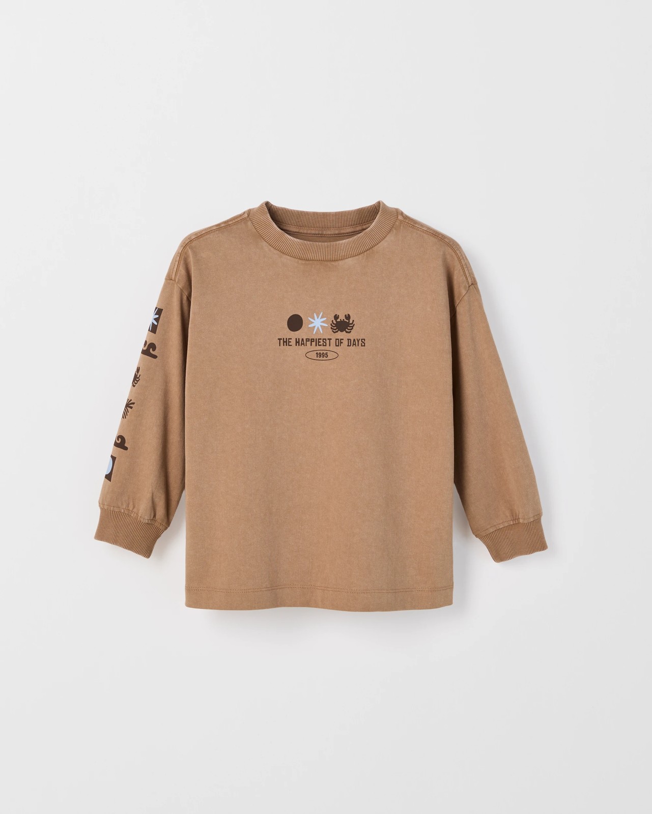 Australian Cotton Long Sleeve Washed Print T-Shirt - Surf Brown
