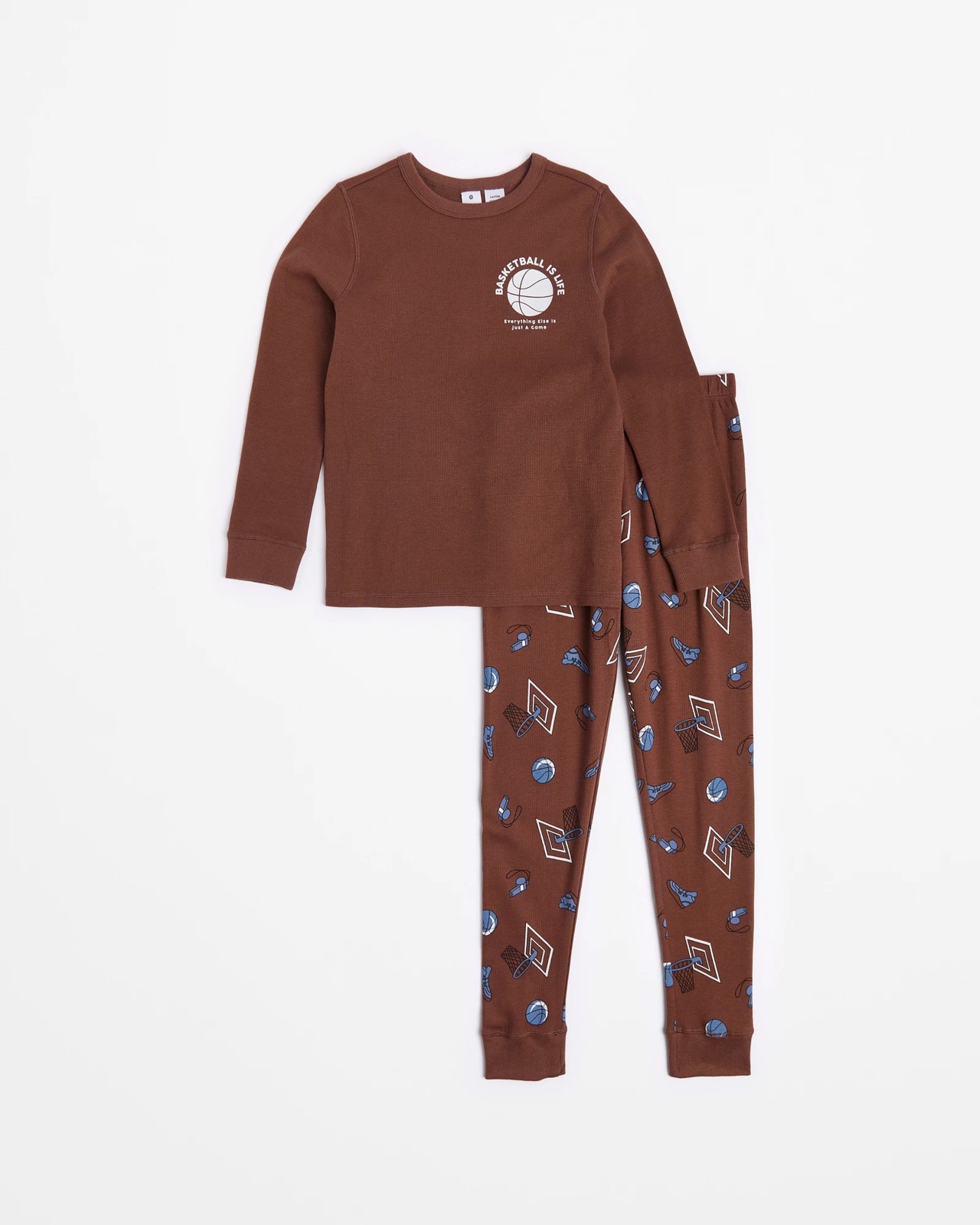 Australian Cotton Older Kids Waffle Pyjama Set - Brown Basketball