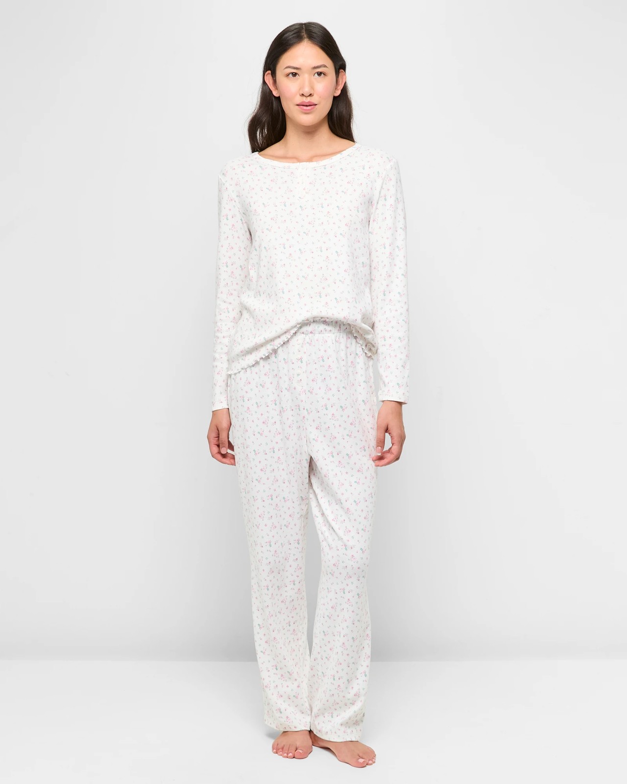 Experience the ultimate comfort with our Australian Cotton Pointelle Long Sleeve Pyjama Set. Made from a cotton-rich blend with a hint of stretch elastane, these pyjamas ensure you stay cosy throughout the night. The delicately detailed pointelle design adds a touch of sophistication, while the ditsy floral print brings a charming vibe. Both pieces feature a regular fit for relaxed wear; the top showcases a ribbed round neckline, button-down front, and long sleeves with a straight lettuce hemline. The pants complete the set with a thick paperbag elastic waistband and a straight cut leg. Treat yourself or make it the ideal gift for a loved one. Don’t wait – add a touch of luxury to your bedtime routine.